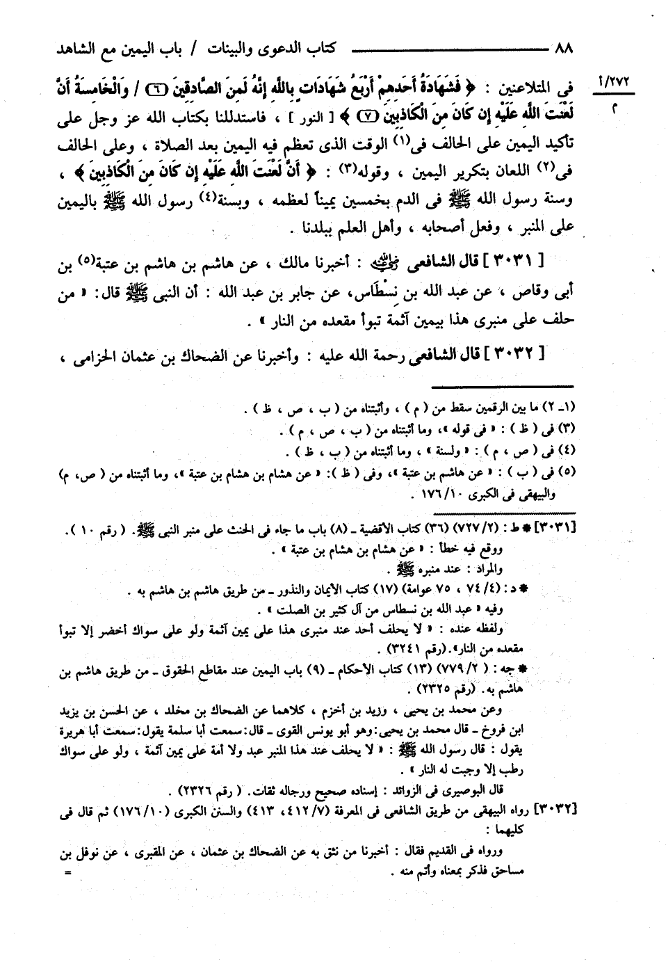 قَالَ الشَّافِعِيُّ: رحمه الله تعالى: أَخْبَرَنَا مَالِكٌ عَنْ هَاشِمِ بْنِ عُتْبَةَ بْنِ أَبِي وَقَّاصٍ عَنْ عَبْدِ اللَّهِ بْنِ نِسْطَاسٍ عَنْ جَابِرِ بْنِ عَبْدِ اللَّهِ أَنَّ النَّبِيَّ - صلى الله عليه وسلم - قَالَ: ? مَنْ حَلَفَ عَلَى مِنْبَرِي هَذَا بِيَمِينٍ آثِمَةٍ تَبَوَّأَ مَقْعَدَهُ مِنْ النَّارِ ?.