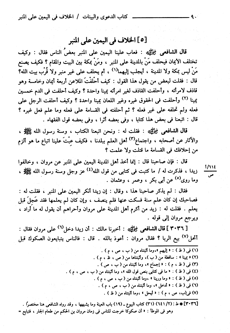 قَالَ الشَّافِعِيُّ : رحمه الله تعالى : فَعَابَ عَلَيْنَا الْيَمِينَ عَلَى الْمِنْبَرِ بَعْضُ النَّاسِ فَقَالَ وَكَيْفَ تَخْتَلِفُ الْأَيْمَانُ فَيَحْلِفُ مَنْ بِالْمَدِينَةِ عَلَى الْمِنْبَرِ وَمَنْ بِمَكَّةَ بَيْنَ الْبَيْتِ , وَالْمَقَامِ ؟ فَكَيْفَ يَصْنَعُ مَنْ لَيْسَ بِمَكَّةَ وَلاَ الْمَدِينَةِ أَيُجْلَبُ إلَيْهِمَا أَمْ يَحْلِفُ عَلَى غَيْرِ مِنْبَرٍ وَلاَ قُرْبِ بَيْتِ اللَّهِ ؟ قَالَ فَقُلْت لِبَعْضِ مَنْ يَقُولُ هَذَا الْقَوْلَ كَيْفَ أَحَلَفْت الْمُلاَعِنَ أَرْبَعَةَ أَيْمَانٍ وَخَامِسَةً وَهُوَ قَاذِفٌ لِامْرَأَتِهِ وَأَحْلَفْت الْقَاذِفَ لِغَيْرِ امْرَأَتِهِ يَمِينًا وَاحِدَةً وَكَيْفَ أَحَلَفْت فِي الدَّمِ خَمْسِينَ وَأَحْلَفْت فِي الْحُقُوقِ غَيْرِهِ وَغَيْرِ اللِّعَانِ يَمِينًا وَاحِدَةً ؟ وَكَيْفَ أَحَلَفْت الرَّجُلَ عَلَى فِعْلِهِ وَلَمْ تُحَلِّفْهُ عَلَى غَيْرِ فِعْلِهِ , ثُمَّ أَحَلَفْتَهُ فِي الْقَسَامَةِ عَلَى فِعْلِهِ وَمَا عَلِمَ فِعْلَ غَيْرِهِ ؟ قَالَ اتَّبَعْنَا فِي بَعْضِ هَذَا كِتَابًا وَفِي بَعْضِهِ أَثَرًا وَفِي بَعْضِهِ قَوْلَ الْفُقَهَاءِ