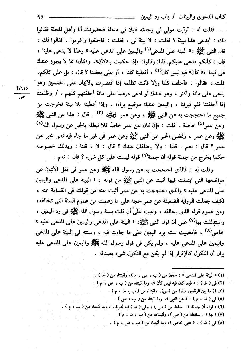 فَقُلْت لَهُ أَرَأَيْت مَوْلًى لِي وَجَدْته قَتِيلاً فِي مَحَلَّةٍ فَحَضَرْتُك أَنَا وَأَهْلُ الْمَحَلَّةِ فَقَالُوا لَك أَيَدَّعِي هَذَا بِبَيِّنَةٍ ؟ فَقُلْت لاَ بَيِّنَةَ لِي فَقُلْت فَاحْلِفُوا وَاغْرَمُوا فَقَالُوا لَك قَالَ النَّبِيُّ - صلى الله عليه وسلم - : ? الْيَمِينُ عَلَى الْمُدَّعَى عَلَيْهِ ? وَهَذَا لاَ يَدَّعِي عَلَيْنَا قَالَ كَأَنَّكُمْ مُدَّعًى عَلَيْكُمْ قُلْنَا وَقَالُوا فَإِذَا حَكَمْت بِكَأَنَّ وَكَأَنَّ مِمَّا لاَ يَجُوزُ عِنْدَك هِيَ فِيمَا كَأَنَّ فِيهِ لَيْسَ كَانَ أَفَعَلَيْنَا كُلُّنَا , أَوْ عَلَى بَعْضِنَا ؟ قَالَ , بَلْ عَلَى كُلِّكُمْ قُلْت فَقَالُوا , فَأَحْلِفْ كُلَّنَا وَإِلَّا , فَأَنْتَ تَظْلِمُهُ إذَا اقْتَصَرْت بِالْأَيْمَانِ عَلَى الْخَمْسِينَ وَهُوَ يَدَّعِي عَلَى مِائَةٍ وَأَكْثَرَ وَهُوَ عِنْدَك لَوْ ادَّعَى دِرْهَمًا عَلَى مِائَةٍ أَحَلَفْتهمْ كُلَّهُمْ وَظَلَمْتنَا إذْ أَحَلَفْتنَا فَلَمْ تُبَرِّئْنَا , وَالْيَمِينُ عِنْدَك مَوْضِعُ بَرَاءَةٍ , وَإِذَا أَعْطَيْته بِلاَ بَيِّنَةٍ فَخَرَجْت مِنْ جَمِيعِ مَا احْتَجَجْت بِهِ عَنْ النَّبِيِّ - صلى الله عليه وسلم - وَعَنْ عُمَرَ رضي الله عنه قَالَ هَذَا عَنْ النَّبِيِّ - صلى الله عليه وسلم - وَعَنْ عُمَرَ خَاصَّةً قُلْت فَإِنْ كَانَ عَنْ عُمَرَ خَاصًّا فَلاَ نُبْطِلُهُ بِالْخَبَرِ عَنْ رَسُولِ اللَّهِ - صلى الله عليه وسلم - وَعَنْ عُمَرَ وَنُمْضِي الْخَبَرَ عَنْ النَّبِيِّ - صلى الله عليه وسلم - وَعَنْ عُمَرَ فِي غَيْرِ مَا جَاءَ فِيهِ نَصُّ خَبَرٍ عَنْ عُمَرَ ؟ قَالَ نَعَمْ قُلْنَا وَلاَ يَخْتَلِفَانِ عِنْدَك ؟ قَالَ لاَ قُلْنَا وَيَدُلُّك خُصُوصُهُ حُكْمًا يَخْرُجُ مِنْ جُمْلَةِ قَوْلِهِ أَنَّ جُمْلَةَ قَوْلِهِ لَيْسَتْ عَلَى كُلِّ شَيْءٍ ؟ قَالَ نَعَمْ وَقُلْت لَهُ فَاَلَّذِي احْتَجَجْت بِهِ عَنْ رَسُولِ اللَّهِ - صلى الله عليه وسلم - وَعَنْ عُمَرَ فِي نَقْلِ الْأَيْمَانِ عَنْ مَوَاضِعِهَا الَّتِي اُبْتُدِئَتْ فِيهَا أَثْبَتُ عَنْ النَّبِيِّ - صلى الله عليه وسلم - مِنْ قَوْلِهِ : ? الْبَيِّنَةُ عَلَى الْمُدَّعِي , وَالْيَمِينُ عَلَى الْمُدَّعَى عَلَيْهِ ? وَاَلَّذِي احْتَجَجْت بِهِ عَنْ عُمَرَ أَثْبَتُ عَنْهُ مِنْ قَوْلِك فِي الْقَسَامَةِ عَنْهُ فَكَيْفَ جَعَلْت الرِّوَايَةَ الضَّعِيفَةَ عَنْ عُمَرَ حُجَّةً عَلَى مَا زَعَمْت مِنْ عُمُومِ السُّنَّةِ الَّتِي تُخَالِفُهُ وَمِنْ عُمُومِ قَوْلِهِ الَّذِي يُخَالِفُهُ وَعِبْت عَلَيَّ أَنْ قُلْتُ بِسُنَّةِ رَسُولِ اللَّهِ - صلى الله عليه وسلم - فِي رَدِّ الْيَمِينِ وَاسْتَدْلَلْت بِهَا عَلَى أَنَّ قَوْلَ النَّبِيِّ - صلى الله عليه وسلم - : ? الْبَيِّنَةُ عَلَى الْمُدَّعِي , وَالْيَمِينُ عَلَى الْمُدَّعَى عَلَيْهِ ? خَاصٌّ , فَأَمْضَيْت سُنَّتَهُ بِرَدِّ الْيَمِينِ عَلَى مَا جَاءَتْ فِيهِ وَسُنَّتُهُ فِي الْبَيِّنَةِ عَلَى الْمُدَّعِي , وَالْيَمِينُ عَلَى الْمُدَّعَى عَلَيْهِ وَلَمْ يَكُنْ فِي قَوْلِ رَسُولِ اللَّهِ - صلى الله عليه وسلم - : ? , وَالْيَمِينُ عَلَى الْمُدَّعَى عَلَيْهِ ? بَيَانٌ أَنَّ النُّكُولَ كَالْإِقْرَارِ إذَا لَمْ يَكُنْ مَعَ النُّكُولِ شَيْءٌ يُصَدِّقُهُ@