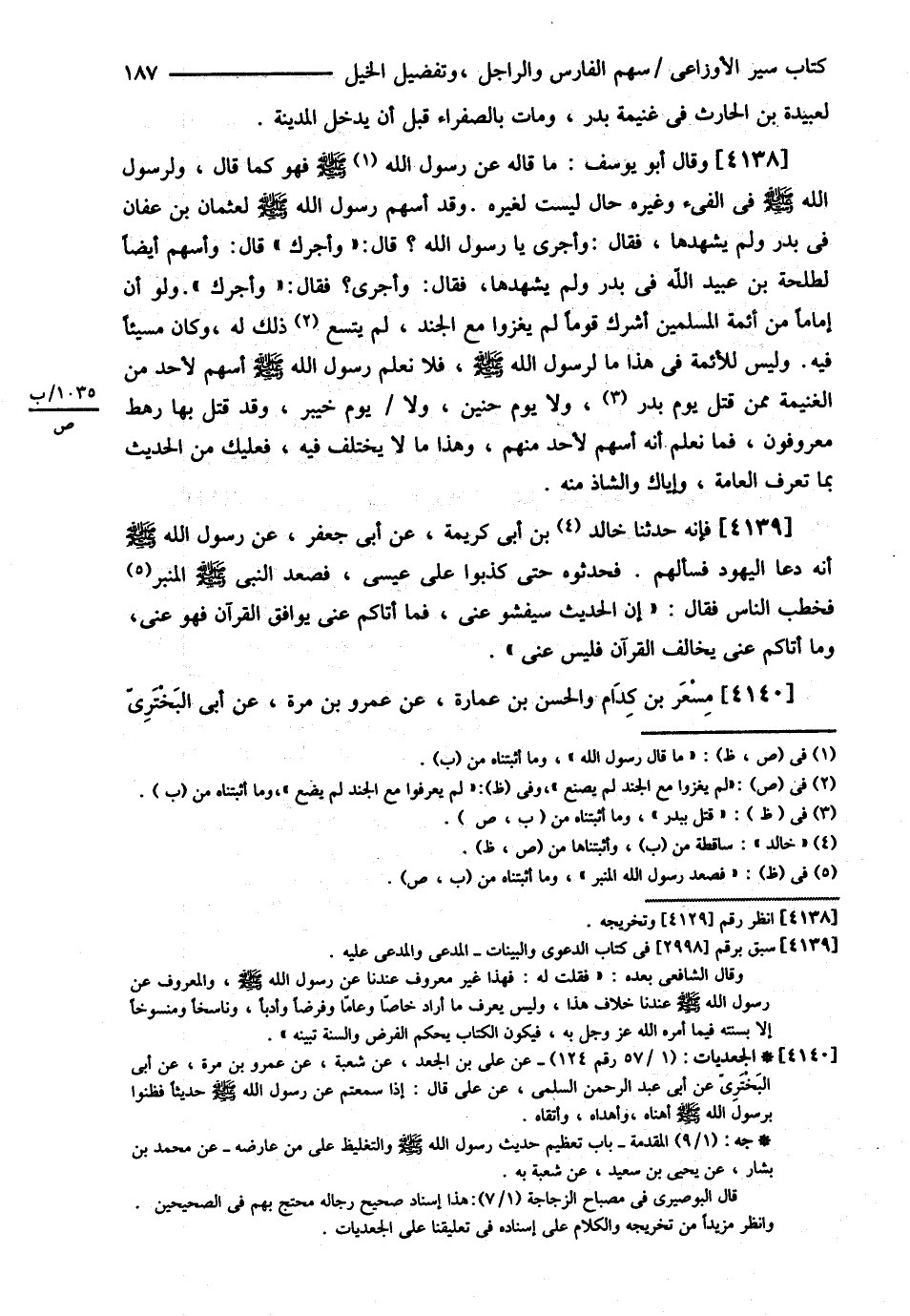 لِعُبَيْدَةَ بْنِ الْحَارِثِ فِي غَنِيمَةِ بَدْرٍ وَمَاتَ بِالصَّفْرَاءِ قَبْلَ أَنْ يَدْخُلَ الْمَدِينَةَ ? . وَقَالَ أَبُو يُوسُفَ مَا قَالَهُ عَنْ رَسُولِ اللَّهِ - صلى الله عليه وسلم - فَهُوَ كَمَا قَالَ وَلِرَسُولِ اللَّهِ - صلى الله عليه وسلم - فِي الْفَيْءِ وَغَيْرِهِ حَالٌ لَيْسَتْ لِغَيْرِهِ وَقَدْ : ? أَسْهَمَ رَسُولُ اللَّهِ - صلى الله عليه وسلم - لِعُثْمَانَ بْنِ عَفَّانَ رضي الله تعالى عنه فِي بَدْرٍ وَلَمْ يَشْهَدْهَا فَقَالَ وَأَجْرِي يَا رَسُولَ اللَّهِ ؟ قَالَ وَأَجْرُك قَالَ وَأَسْهَمَ أَيْضًا لِطَلْحَةَ بْنِ عُبَيْدِ اللَّهِ فِي بَدْرٍ وَلَمْ يَشْهَدْهَا فَقَالَ وَأَجْرِي ؟ فَقَالَ وَأَجْرُك ? وَلَوْ أَنَّ إمَامًا مِنْ أَئِمَّةِ الْمُسْلِمِينَ أَشْرَكَ قَوْمًا لَمْ يَغْزُوا مَعَ الْجُنْدِ لَمْ يَتَّسِعْ ذَلِكَ لَهُ وَكَانَ مُسِيئًا فِيهِ وَلَيْسَ لِلْأَئِمَّةِ فِي هَذَا مَا لِرَسُولِ اللَّهِ - صلى الله عليه وسلم - فَلاَ نَعْلَمُ رَسُولَ اللَّهِ - صلى الله عليه وسلم - أَسْهَمَ لِأَحَدٍ مِنْ الْغَنِيمَةِ مِمَّنْ قُتِلَ يَوْمَ بَدْرٍ وَلاَ يَوْمَ حُنَيْنٍ وَلاَ يَوْمَ خَيْبَرَ وَقَدْ قُتِلَ بِهَا رَهْطٌ مَعْرُوفُونَ فَمَا نَعْلَمُ أَنَّهُ أَسْهَمَ لِأَحَدٍ مِنْهُمْ . وَهَذَا مَا لاَ يَخْتَلِفُ فِيهِ فَعَلَيْك مِنْ الْحَدِيثِ بِمَا تَعْرِفُ الْعَامَّةُ وَإِيَّاكَ وَالشَّاذَّ مِنْهُ فَإِنَّهُ حَدَّثَنَا ابْنُ أَبِي كَرِيمَةَ عَنْ أَبِي جَعْفَرٍ : ? عَنْ رَسُولِ اللَّهِ - صلى الله عليه وسلم - أَنَّهُ دَعَا الْيَهُودَ فَسَأَلَهُمْ فَحَدَّثُوهُ حَتَّى كَذَبُوا عَلَى عِيسَى فَصَعِدَ النَّبِيُّ - صلى الله عليه وسلم - الْمِنْبَرَ فَخَطَبَ النَّاسَ فَقَالَ إنَّ الْحَدِيثَ سَيَفْشُو عَنِّي فَمَا أَتَاكُمْ عَنِّي يُوَافِقُ الْقُرْآنَ فَهُوَ عَنِّي وَمَا أَتَاكُمْ عَنِّي يُخَالِفُ الْقُرْآنَ فَلَيْسَ عَنِّي ? مِسْعَرُ بْنُ كِدَامٍ وَالْحَسَنُ بْنُ عُمَارَةَ عَنْ عَمْرِو بْنِ مُرَّةَ عَنْ الْبَخْتَرِيِّ@