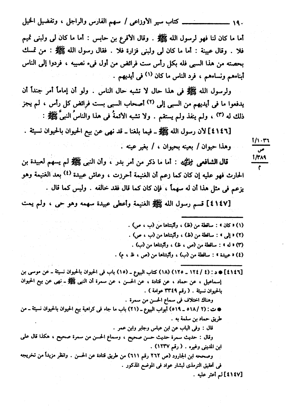 قَالَ الشَّافِعِيُّ : رحمه الله تعالى أَمَّا مَا ذُكِرَ مِنْ أَمْرِ بَدْرٍ وَأَنَّ النَّبِيَّ - صلى الله عليه وسلم - لَمْ يُسْهِمْ لِعُبَيْدَةَ بْنِ الْحَارِثِ فَهُوَ عَلَيْهِ إنْ كَانَ كَمَا زَعَمَ أَنَّ الْغَنِيمَةَ أُحْرِزَتْ وَعَاشَ بَعْدَ الْغَنِيمَةِ وَهُوَ يَزْعُمُ فِي مِثْلِ هَذَا أَنَّ لَهُ سَهْمًا فَإِنْ كَانَ كَمَا قَالَ فَقَدْ خَالَفَهُ وَلَيْسَ كَمَا قَالَ قَسَّمَ رَسُولُ اللَّهِ - صلى الله عليه وسلم - الْغَنِيمَةَ وَأَعْطَى عُبَيْدَةَ سَهْمَهُ وَهُوَ حَيٌّ وَلَمْ يَمُتْ@