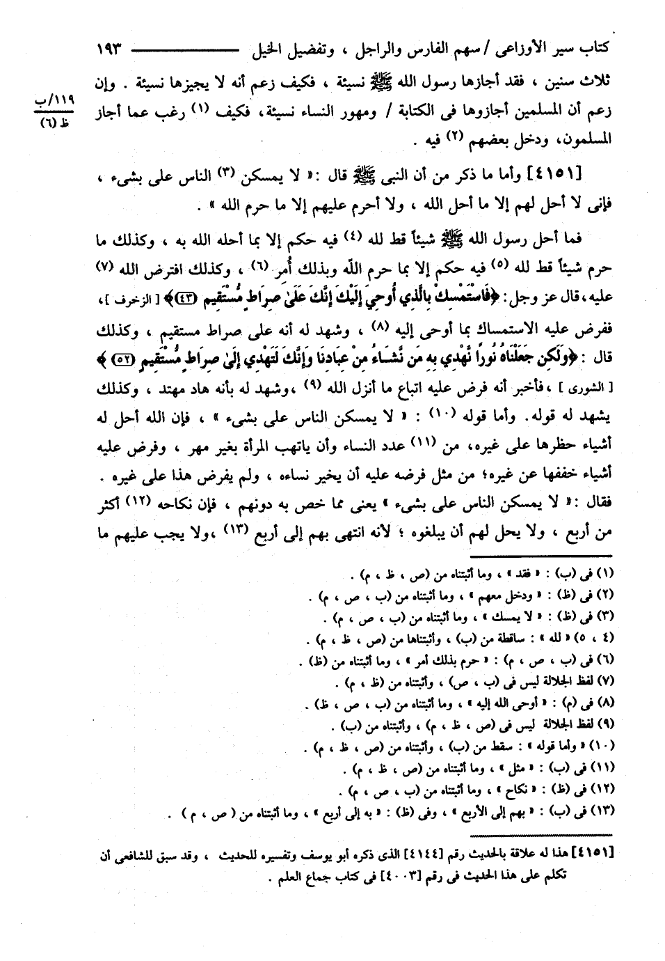 ثَلاَثِ سِنِينَ فَقَدْ أَجَازَهَا رَسُولُ اللَّهِ - صلى الله عليه وسلم - نَسِيئَةً فَكَيْفَ زَعَمَ أَنَّهُ لاَ يُجِيزُهَا نَسِيئَةً وَإِنْ زَعَمَ أَنَّ الْمُسْلِمِينَ أَجَازُوهَا فِي الْكِتَابَةِ وَمُهُورِ النِّسَاءِ نَسِيئَةً فَقَدْ رَغِبَ عَمَّا أَجَازَ الْمُسْلِمُونَ وَدَخَلَ بَعْضُهُمْ فِيهِ وَأَمَّا مَا ذَكَرَ مِنْ أَنَّ النَّبِيَّ - صلى الله عليه وسلم - قَالَ : ? لاَ يُمْسِكَنَّ النَّاسُ عَلَيَّ بِشَيْءٍ فَإِنِّي لاَ أُحِلُّ لَهُمْ إلَّا مَا أَحَلَّ اللَّهُ وَلاَ أُحَرِّمُ عَلَيْهِمْ إلَّا مَا حَرَّمَ اللَّهُ ? فَمَا أَحَلَّ رَسُولُ اللَّهِ - صلى الله عليه وسلم - شَيْئًا قَطُّ فِيهِ حُكْمٌ إلَّا بِمَا أَحَلَّهُ اللَّهُ بِهِ وَكَذَلِكَ مَا حَرَّمَ شَيْئًا قَطُّ فِيهِ حُكْمٌ إلَّا بِمَا حَرَّمَ بِذَلِكَ أَمْرٌ وَكَذَلِكَ اُفْتُرِضَ عَلَيْهِ قَالَ اللَّهُ عَزَّ وَجَلَّ : ? فَاسْتَمْسِكْ بِاَلَّذِي أُوحِيَ إلَيْك إنَّك عَلَى صِرَاطٍ مُسْتَقِيمٍ ? فَفَرَضَ عَلَيْهِ الِاسْتِمْسَاكَ بِمَا أُوحِيَ إلَيْهِ وَشَهِدَ لَهُ أَنَّهُ عَلَى صِرَاطٍ مُسْتَقِيمٍ وَكَذَلِكَ قَالَ : ? وَلَكِنْ جَعَلْنَاهُ نُورًا نَهْدِي بِهِ مَنْ نَشَاءُ مِنْ عِبَادِنَا وَإِنَّك لَتَهْدِي إلَى صِرَاطٍ مُسْتَقِيمٍ ? فَأَخْبَرَ أَنَّهُ فَرَضَ عَلَيْهِ اتِّبَاعَ مَا أَنْزَلَ اللَّهُ وَشَهِدَ لَهُ بِأَنَّهُ هَادٍ مُهْتَدٍ . وَكَذَلِكَ يَشْهَدُ لَهُ قَوْلُهُ : ? لاَ يُمْسِكَنَّ النَّاسُ عَلَيَّ بِشَيْءٍ ? فَإِنَّ اللَّهَ أَحَلَّ لَهُ أَشْيَاءَ حَظَرَهَا عَلَى غَيْرِهِ مِثْلَ عَدَدِ النِّسَاءِ وَأَنْ يَتَّهِبَ الْمَرْأَةَ بِغَيْرِ مَهْرٍ وَفَرَضَ عَلَيْهِ أَشْيَاءَ خَفَّفَهَا عَنْ غَيْرِهِ مِثْلَ فَرْضُهُ عَلَيْهِ أَنْ يُخَيِّرَ نِسَاءَهُ وَلَمْ يَفْرِضْ هَذَا عَلَى غَيْرِهِ فَقَالَ : ? لاَ يُمْسِكَنَّ النَّاسُ عَلَيَّ بِشَيْءٍ ? يَعْنِي مِمَّا خُصَّ بِهِ دُونَهُمْ فَإِنَّ نِكَاحَهُ أَكْثَرُ مِنْ أَرْبَعٍ وَلاَ يَحِلُّ لَهُمْ أَنْ يَبْلُغُوهُ لِأَنَّهُ انْتَهَى بِهِمْ إلَى الْأَرْبَعِ وَلاَ يَجِبُ عَلَيْهِمْ مَا @