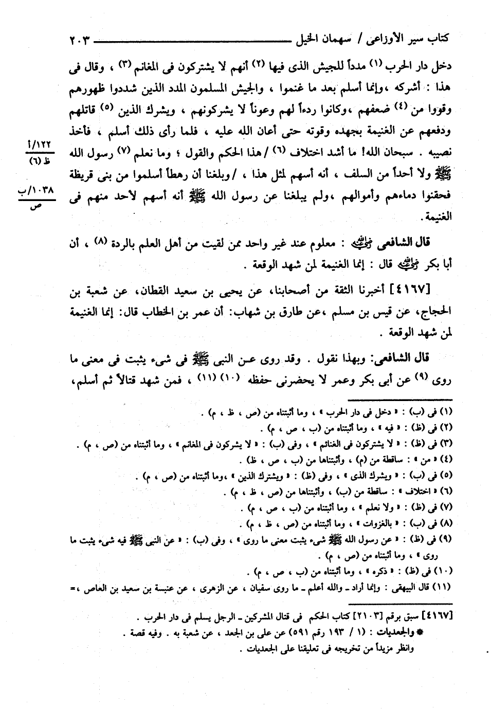 قَالَ الشَّافِعِيُّ : رحمه الله تعالى مَعْلُومٌ عِنْدَ غَيْرِ وَاحِدٍ مِمَّنْ لَقِيت مِنْ أَهْلِ الْعِلْمِ بِالْغَزَوَاتِ أَنَّ أَبَا بَكْرٍ رضي الله تعالى عنه قَالَ إنَّمَا الْغَنِيمَةُ لِمَنْ شَهِدَ الْوَقْعَةَ أَخْبَرَنَا الثِّقَةُ مِنْ أَصْحَابِنَا عَنْ يَحْيَى بْنِ سَعِيدٍ الْقَطَّانِ عَنْ شُعْبَةَ بْنِ الْحَجَّاجِ عَنْ قَيْسِ بْنِ مُسْلِمٍ عَنْ طَارِقِ بْنِ شِهَابٍ أَنَّ عُمَرَ بْنَ الْخَطَّابِ رضي الله تعالى عنه قَالَ إنَّمَا الْغَنِيمَةُ لِمَنْ شَهِدَ الْوَقْعَةَ .