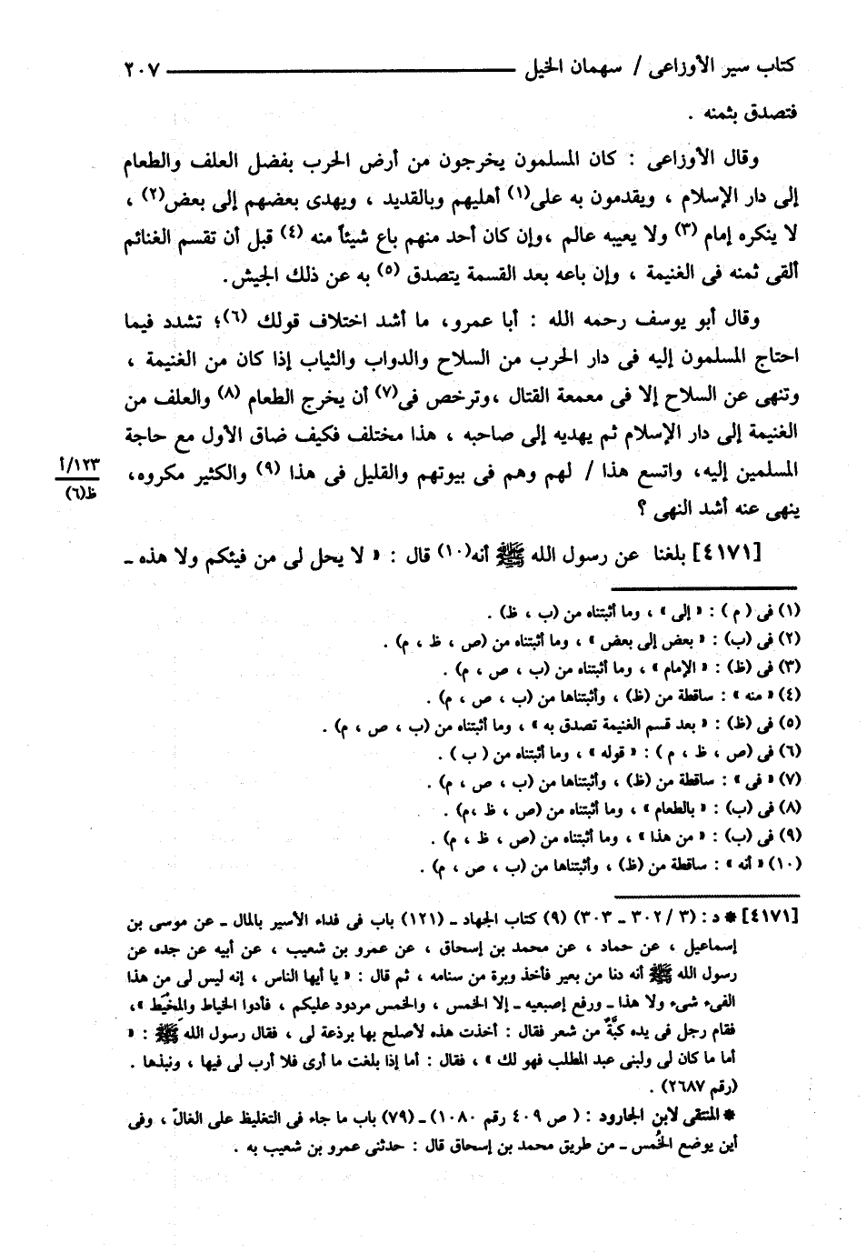 فَتَصَدَّقَ بِثَمَنِهِ وَقَالَ الْأَوْزَاعِيُّ كَانَ الْمُسْلِمُونَ يَخْرُجُونَ مِنْ أَرْضِ الْحَرْبِ بِفَضْلِ الْعَلَفِ وَالطَّعَامِ إلَى دَارِ الْإِسْلاَمِ وَيَقْدَمُونَ بِهِ عَلَى أَهْلِيهِمْ وَبِالْقَدِيدِ وَيُهْدِي بَعْضٌ إلَى بَعْضٍ لاَ يُنْكِرُهُ إمَامٌ وَلاَ يَعِيبُهُ عَالِمٌ وَإِنْ كَانَ أَحَدٌ مِنْهُمْ بَاعَ شَيْئًا مِنْهُ قَبْلَ أَنْ تُقَسَّمَ الْغَنَائِمَ أَلْقَى ثَمَنَهُ فِي الْغَنِيمَةِ وَإِنْ بَاعَهُ بَعْدَ الْقِسْمَةِ يَتَصَدَّقُ بِهِ عَنْ ذَلِكَ الْجَيْشِ . وَقَالَ أَبُو يُوسُفَ أَبَا عَمْرٍو مَا أَشَدَّ اخْتِلاَفَ قَوْلِك تُشَدِّدُ فِيمَا احْتَاجَ الْمُسْلِمُونَ إلَيْهِ فِي دَارِ الْحَرْبِ مِنْ السِّلاَحِ وَالدَّوَابِّ وَالثِّيَابِ إذَا كَانَ مِنْ الْغَنِيمَةِ وَتَنْهَى عَنْ السِّلاَحِ إلَّا فِي مَعْمَعَةِ الْقِتَالِ وَتُرَخِّصُ فِي أَنْ يَخْرُجَ بِالطَّعَامِ وَالْعَلَفِ مِنْ الْغَنِيمَةِ إلَى دَارِ الْإِسْلاَمِ ثُمَّ يُهْدِيهِ إلَى صَاحِبِهِ هَذَا مُخْتَلِفٌ فَكَيْفَ ضَاقَ الْأَوَّلُ مَعَ حَاجَةِ الْمُسْلِمِينَ إلَيْهِ وَاتَّسَعَ هَذَا لَهُمْ وَهُمْ فِي بُيُوتِهِمْ وَالْقَلِيلُ مِنْ هَذَا وَالْكَثِيرُ مَكْرُوهٌ يُنْهَى عَنْهُ أَشَدَّ النَّهْيِ ؟ بَلَغَنَا عَنْ رَسُولِ اللَّهِ - صلى الله عليه وسلم - أَنَّهُ قَالَ : ? لاَ يَحِلُّ لِي مِنْ فَيْئِكُمْ وَلاَ هَذِهِ @