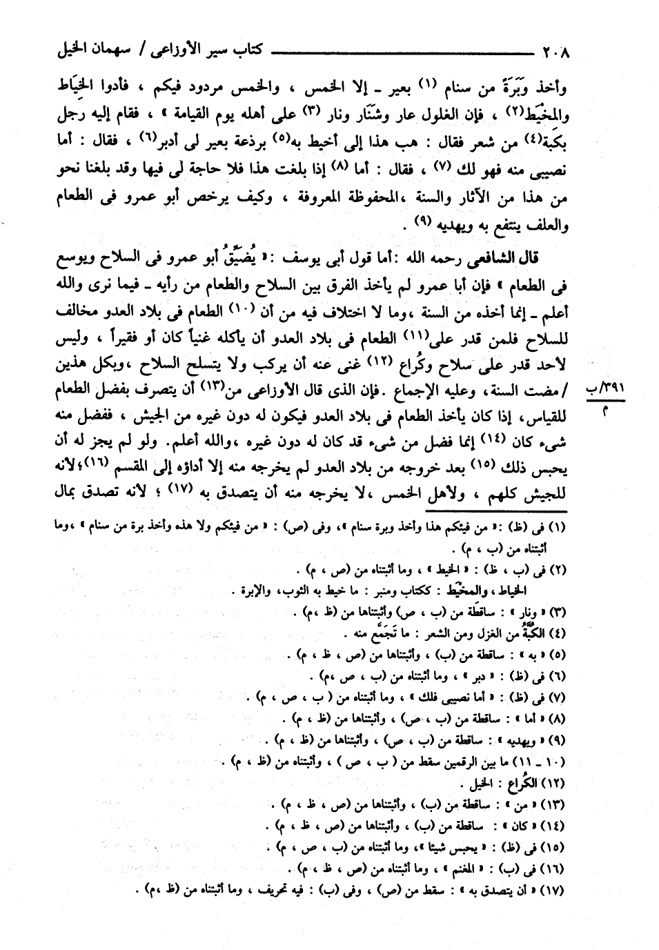 قَالَ الشَّافِعِيُّ : رحمه الله تعالى : أَمَّا قَوْلُ أَبِي يُوسُفَ يُضَيِّقُ أَبُو عَمْرٍو فِي السِّلاَحِ وَيُوَسِّعُ فِي الطَّعَامِ فَإِنَّ أَبَا عَمْرٍو لَمْ يَأْخُذْ الْفَرْقَ بَيْنَ السِّلاَحِ وَالطَّعَامِ مِنْ رَأْيِهِ فِيمَا نَرَى وَاَللَّهُ تَعَالَى أَعْلَمُ , إنَّمَا أَخَذَهُ مِنْ السُّنَّةِ وَمَا لاَ اخْتِلاَفَ فِيهِ مِنْ جَوَازِ الطَّعَامِ فِي بِلاَدِ الْعَدُوِّ أَنْ يَأْكُلَهُ غَنِيًّا كَانَ أَوْ فَقِيرًا وَلَيْسَ لِأَحَدٍ قَدَرَ عَلَى سِلاَحٍ وَكُرَاعٍ غِنًى عَنْهُ أَنْ يَرْكَبَ وَلاَ يَتَسَلَّحَ السِّلاَحَ وَبِكُلِّ هَذَيْنِ مَضَتْ السُّنَّةُ وَعَلَيْهِ الْإِجْمَاعُ فَإِنَّ الَّذِي قَالَ الْأَوْزَاعِيُّ أَنْ يَتَصَرَّفَ بِفَضْلِ الطَّعَامِ لِلْقِيَاسِ إذَا كَانَ يَأْخُذُ الطَّعَامَ فِي بِلاَدِ الْعَدُوِّ فَيَكُونُ لَهُ دُونَ غَيْرِهِ مِنْ الْجَيْشِ فَفَضَلَ مِنْهُ شَيْءٌ إنَّمَا فَضَلَ مِنْ شَيْءٍ قَدْ كَانَ لَهُ دُونَ غَيْرِهِ وَاَللَّهُ أَعْلَمُ . وَلَوْ لَمْ يَجُزْ لَهُ أَنْ يَحْبِسَ ذَلِكَ بَعْدَ خُرُوجِهِ مِنْ بِلاَدِ الْعَدُوِّ لَمْ يُخْرِجْهُ مِنْهُ إلَّا أَدَاؤُهُ إلَى الْمَغْنَمِ لِأَنَّهُ لِلْجَيْشِ كُلِّهِمْ وَلِأَهْلِ الْخُمُسِ لاَ يُخْرِجُهُ مِنْهُ التَّصَدُّقُ بِهِ لِأَنَّهُ تَصَدُّقٌ بِمَالِ@