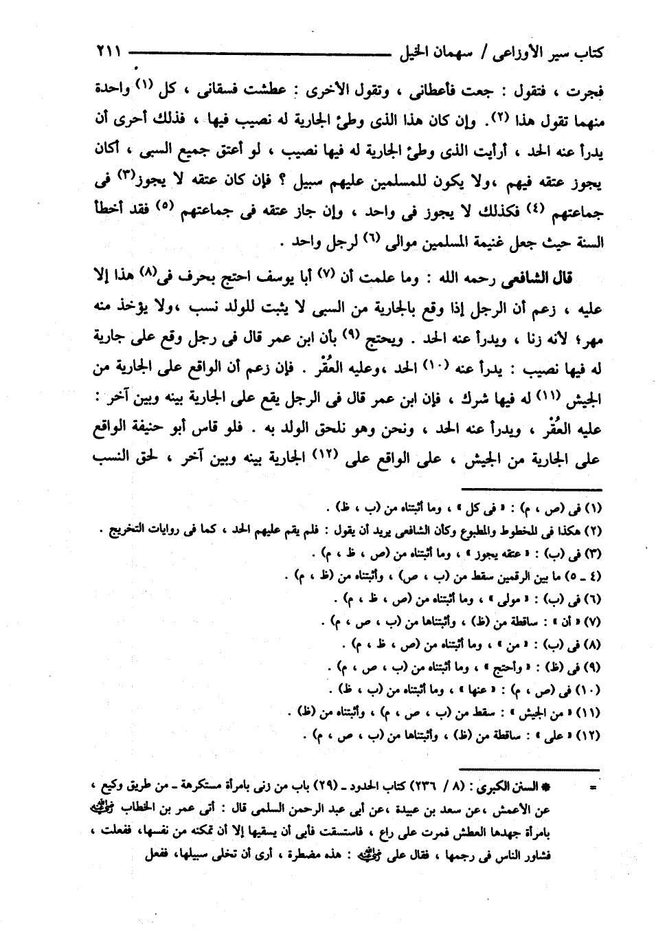 قَالَ الشَّافِعِيُّ : رحمه الله تعالى وَمَا عَلِمْت أَنَّ أَبَا يُوسُفَ احْتَجَّ بِحَرْفٍ مِنْ هَذَا إلَّا عَلَيْهِ زَعَمَ أَنَّ الرَّجُلَ إذَا وَقَعَ بِالْجَارِيَةِ مِنْ السَّبْيِ لاَ يَثْبُتُ لِلْوَلَدِ نَسَبٌ وَلاَ يُؤْخَذُ مِنْهُ مَهْرٌ لِأَنَّهُ زِنًا وَيُدْرَأُ عَنْهُ الْحَدُّ وَيَحْتَجُّ بِأَنَّ ابْنَ عُمَرَ قَالَ فِي رَجُلٍ وَقَعَ عَلَى جَارِيَةٍ لَهُ فِيهَا نَصِيبٌ يُدْرَأُ عَنْهُ الْحَدُّ وَعَلَيْهِ الْعُقْرُ فَإِنْ زَعَمَ أَنَّ الْوَاقِعَ عَلَى الْجَارِيَةِ لَهُ فِيهَا شِرْكٌ فَإِنَّ ابْنَ عُمَرَ قَالَ فِي الرَّجُلِ يَقَعُ عَلَى الْجَارِيَةِ بَيْنَهُ وَبَيْنَ آخَرِ عَلَيْهِ الْعُقْرُ وَيُدْرَأُ عَنْهُ الْحَدُّ وَنَحْنُ وَهُوَ نُلْحِقُ الْوَلَدَ بِهِ فَلَوْ قَاسَ أَبُو حَنِيفَةَ رحمه الله تعالى الْوَاقِعَ عَلَى الْجَارِيَةِ مِنْ الْجَيْشِ عَلَى الْوَاقِعِ عَلَى الْجَارِيَةِ بَيْنَهُ وَبَيْنَ آخَرَ لَحِقَ النَّسَبَ @