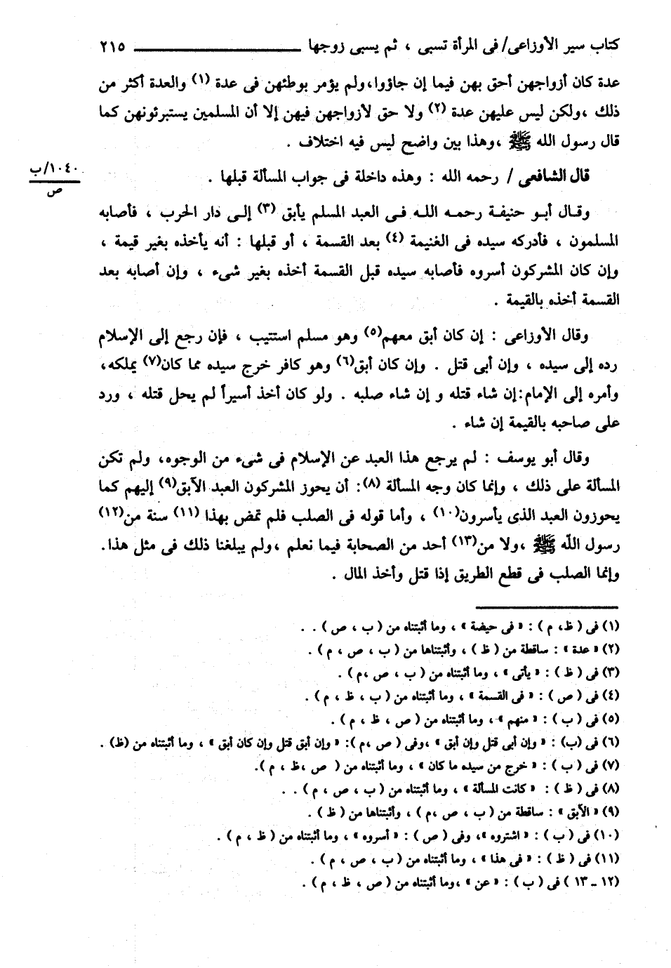 وَقَالَ أَبُو حَنِيفَةَ رحمه الله تعالى فِي الْعَبْدِ الْمُسْلِمِ يَأْبَقُ إلَى دَارِ الْحَرْبِ فَأَصَابَهُ الْمُسْلِمُونَ فَأَدْرَكَهُ سَيِّدُهُ فِي الْغَنِيمَةِ بَعْدَ الْقِسْمَةِ أَوْ قَبْلَهَا أَنَّهُ يَأْخُذُهُ بِغَيْرِ قِيمَةٍ وَإِنْ كَانَ الْمُشْرِكُونَ أَسَرُوهُ فَأَصَابَهُ سَيِّدُهُ قَبْلَ الْقِسْمَةِ أَخَذَهُ بِغَيْرِ شَيْءٍ وَإِنْ أَصَابَهُ بَعْدَ الْقِسْمَةِ أَخَذَهُ بِالْقِيمَةِ وَقَالَ الْأَوْزَاعِيُّ إنْ كَانَ أَبَقَ مِنْهُمْ وَهُوَ مُسْلِمٌ اُسْتُتِيبَ فَإِنْ رَجَعَ إلَى الْإِسْلاَمِ رَدَّهُ إلَى سَيِّدِهِ وَإِنْ أَبَى قُتِلَ وَإِنْ أَبَقَ وَهُوَ كَافِرٌ خَرَجَ مِنْ سَيِّدِهِ مَا كَانَ يَمْلِكُهُ وَأَمْرُهُ إلَى الْإِمَامِ إنْ شَاءَ قَتَلَهُ وَإِنْ شَاءَ صَلَبَهُ وَلَوْ كَانَ أُخِذَ أَسِيرًا لَمْ يَحِلَّ قَتْلُهُ وَرُدَّ عَلَى صَاحِبِهِ بِالْقِيمَةِ إنْ شَاءَ وَقَالَ أَبُو يُوسُفَ لَمْ يَرْجِعْ هَذَا الْعَبْدُ عَنْ الْإِسْلاَمِ فِي شَيْءٍ مِنْ الْوُجُوهِ وَلَمْ تَكُنْ الْمَسْأَلَةُ عَلَى ذَلِكَ وَإِنَّمَا كَانَ وَجْهُ الْمَسْأَلَةِ أَنْ يَحُوزَ الْمُشْرِكُونَ الْعَبْدَ إلَيْهِمْ كَمَا يَحُوزُونَ الْعَبْدَ الَّذِي اشْتَرَوْهُ . وَأَمَّا قَوْلُهُ فِي الصَّلْبِ فَلَمْ تَمْضِ بِهَذَا سُنَّةٌ عَنْ رَسُولِ اللَّهِ - صلى الله عليه وسلم - وَلاَ عَنْ أَحَدٍ مِنْ أَصْحَابِهِ فِيمَا نَعْلَمُ وَلَمْ يَبْلُغْنَا ذَلِكَ فِي مِثْلِ هَذَا وَإِنَّمَا الصَّلْبُ فِي قَطْعِ الطَّرِيقِ إذَا قَتَلَ وَأَخَذَ الْمَالَ .@