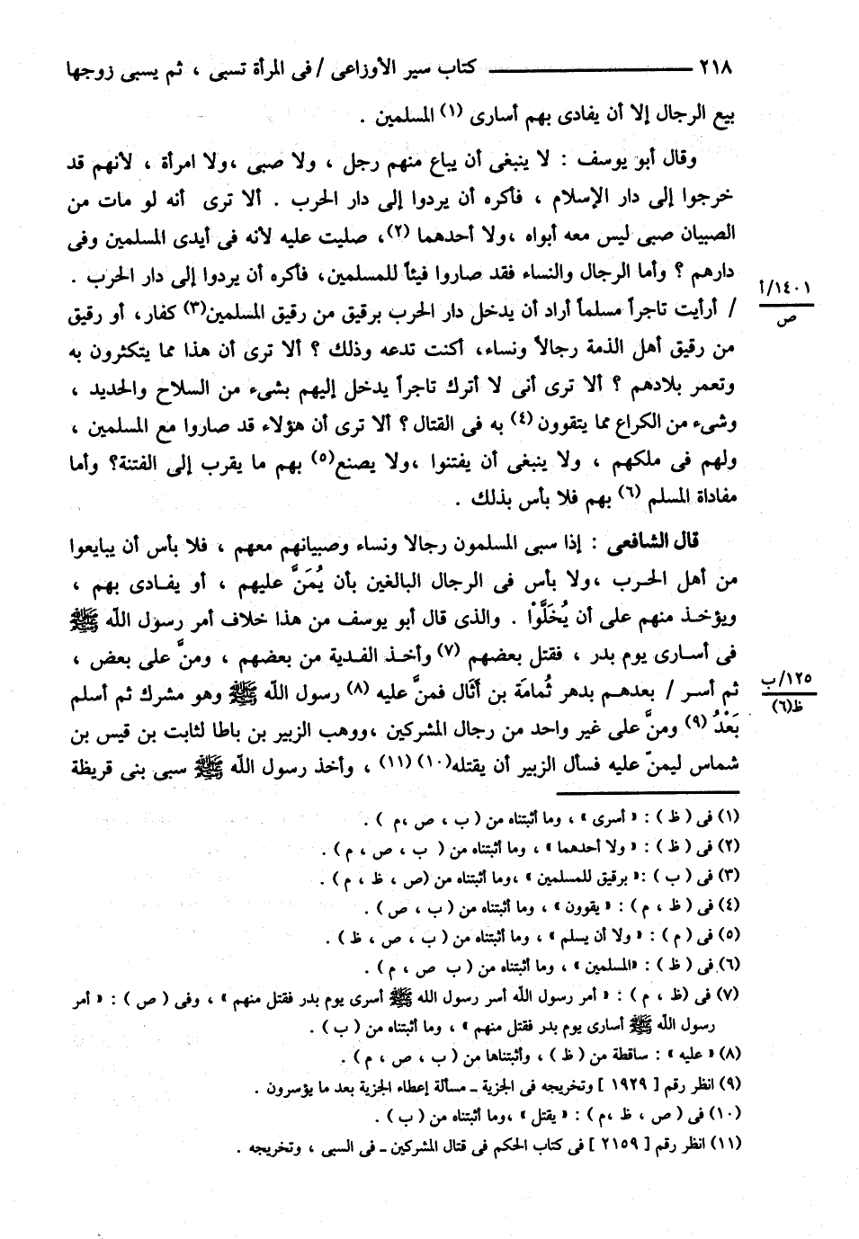 قَالَ الشَّافِعِيُّ : رحمه الله تعالى إذَا سَبَى الْمُسْلِمُونَ رِجَالاً وَنِسَاءً وَصِبْيَانُهُمْ مَعَهُمْ فَلاَ بَأْسَ أَنْ يُبَاعُوا مِنْ أَهْلِ الْحَرْبِ وَلاَ بَأْسَ فِي الرِّجَالِ الْبَالِغِينَ بِأَنْ يَمُنَّ عَلَيْهِمْ أَوْ يُفَادِيَ بِهِمْ وَيُؤْخَذَ مِنْهُمْ عَلَى أَنْ يُخْلُوا وَاَلَّذِي قَالَ أَبُو يُوسُفَ مِنْ هَذَا خِلاَفُ أَمْرِ رَسُولِ اللَّهِ - صلى الله عليه وسلم - فِي أُسَارَى يَوْمِ بَدْرٍ فَقَتَلَ بَعْضَهُمْ وَأَخَذَ الْفِدْيَةَ مِنْ بَعْضِهِمْ وَمَنَّ عَلَى بَعْضٍ ثُمَّ أَسَرَ بَعْدَهُمْ بِدَهْرٍ ثُمَامَةَ بْنَ أُثَالٍ فَمَنَّ عَلَيْهِ رَسُولُ اللَّهِ - صلى الله عليه وسلم - وَهُوَ مُشْرِكٌ ثُمَّ أَسْلَمَ بَعْدُ وَمَنَّ عَلَى غَيْرِ وَاحِدٍ مِنْ رِجَالِ الْمُشْرِكِينَ وَوَهَبَ الزُّبَيْرَ بْنَ بَاطَا لِثَابِتِ بْنِ قَيْسِ بْنِ شِمَاسٍ لِيَمُنَّ عَلَيْهِ فَسَأَلَ الزُّبَيْرُ أَنْ يَقْتُلَهُ وَأَخَذَ رَسُولُ اللَّهِ - صلى الله عليه وسلم - سَبْيَ بَنِي قُرَيْظَةَ@