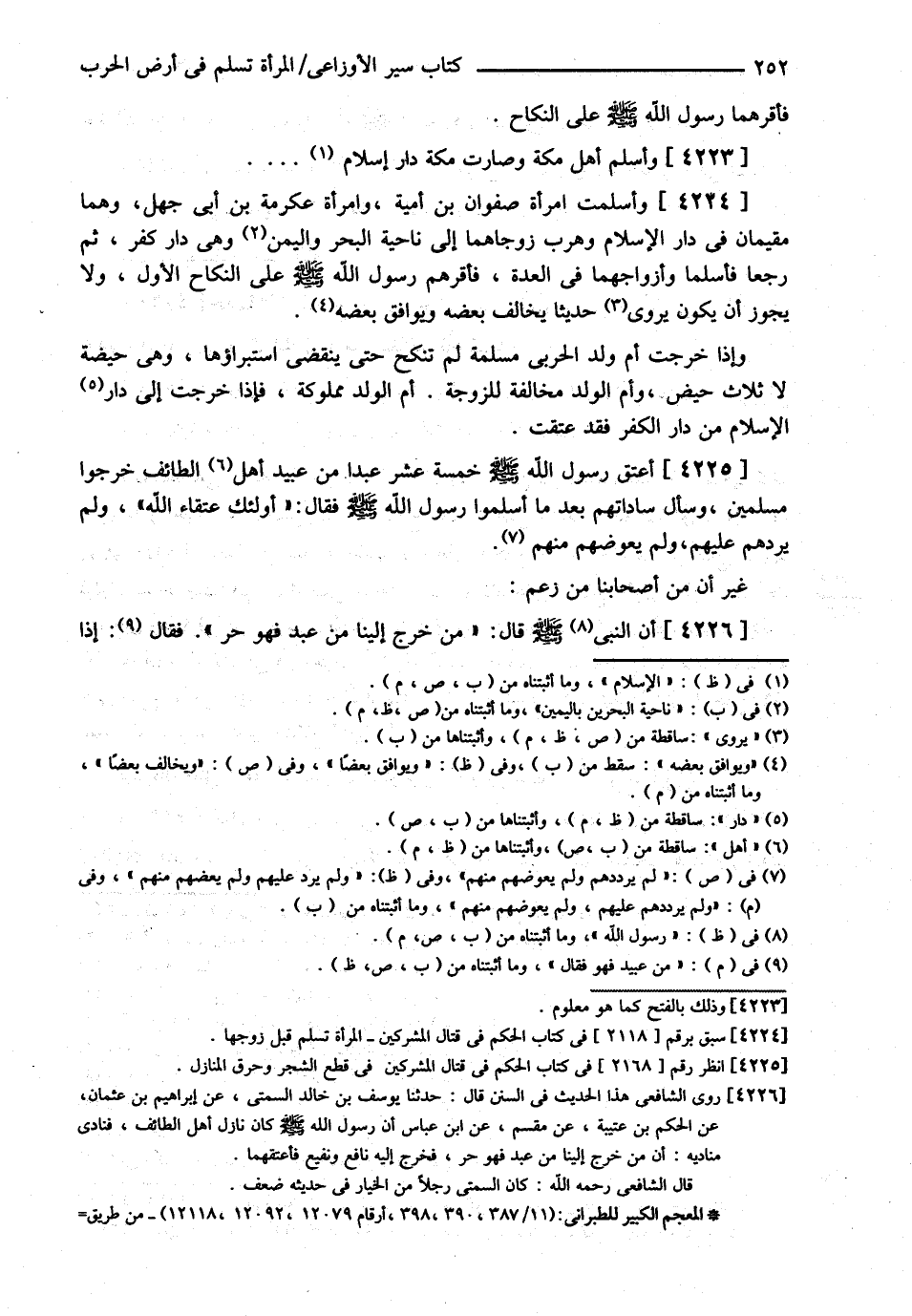 فَأَقَرَّهُمَا رَسُولُ اللَّهِ - صلى الله عليه وسلم - عَلَى النِّكَاحِ ? وَأَسْلَمَ أَهْلُ مَكَّةَ وَصَارَتْ مَكَّةُ دَارَ إسْلاَمٍ : ? وَأَسْلَمَتْ امْرَأَةُ صَفْوَانَ بْنِ أُمَيَّةَ وَامْرَأَةُ عِكْرِمَةَ بْنِ أَبِي جَهْلٍ وَهُمَا مُقِيمَانِ فِي دَارِ الْإِسْلاَمِ وَهَرَبَ زَوْجَاهُمَا إلَى نَاحِيَةِ الْبَحْرَيْنِ بِالْيَمَنِ يَجُوزُ وَهِيَ دَارُ كُفْرٍ ثُمَّ رَجَعَا فَأَسْلَمَا وَأَزْوَاجُهُمَا فِي الْعِدَّةِ فَأَقَرَّهُمْ رَسُولُ اللَّهِ - صلى الله عليه وسلم - عَلَى النِّكَاحِ الْأَوَّلِ ? وَلاَ أَنْ يَكُونَ يَرْوِي حَدِيثًا يُخَالِفُ بَعْضَهُ وَإِذَا خَرَجَتْ أُمُّ وَلَدِ الْحَرْبِيِّ مُسْلِمَةً لَمْ تُنْكَحْ حَتَّى يَنْقَضِيَ اسْتِبْرَاؤُهَا وَهِيَ حَيْضَةٌ لاَ ثَلاَثُ حِيَضٍ وَأُمُّ الْوَلَدِ مُخَالِفَةٌ لِلزَّوْجَةِ أُمُّ الْوَلَدِ مَمْلُوكَةٌ فَإِذَا خَرَجَتْ إلَى دَارِ الْإِسْلاَمِ مِنْ دَارِ الْكُفْرِ فَقَدْ عَتَقَتْ : ? أَعْتَقَ رَسُولُ اللَّهِ - صلى الله عليه وسلم - خَمْسَةَ عَشَرَ عَبْدًا مِنْ عَبِيدِ الطَّائِفِ خَرَجُوا مُسْلِمِينَ وَسَأَلَ سَادَاتُهُمْ بَعْدَمَا أَسْلَمُوا رَسُولَ اللَّهِ - صلى الله عليه وسلم - فَقَالَ أُولَئِكَ عُتَقَاءُ اللَّهِ ? وَلَمْ يَرُدَّهُمْ وَلَمْ يُعَوِّضْهُمْ مِنْهُمْ . غَيْرَ أَنَّ مِنْ أَصْحَابِنَا مَنْ زَعَمَ أَنَّ النَّبِيَّ - صلى الله عليه وسلم - قَالَ : ? مَنْ خَرَجَ إلَيْنَا مِنْ عَبْدٍ فَهُوَ حُرٌّ ? فَقَالَ إذَا@