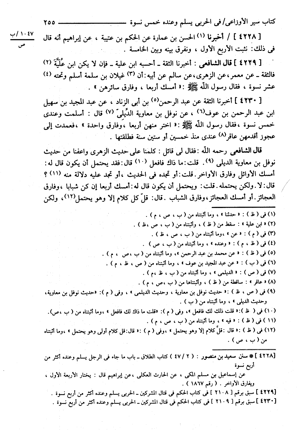 قَالَ الشَّافِعِيُّ : رحمه الله تعالى أَخْبَرَنَا الثِّقَةُ أَحْسَبُهُ ابْنَ عُلَيَّةَ فَإِنْ لاَ يَكُنْ ابْنُ عُلَيَّةَ فَالثِّقَةُ عَنْ مَعْمَرٍ عَنْ الزُّهْرِيِّ عَنْ سَالِمٍ عَنْ أَبِيهِ : ? أَنَّ غَيْلاَنَ بْنَ سَلَمَةَ أَسْلَمَ وَتَحْتَهُ عَشْرُ نِسْوَةٍ فَقَالَ رَسُولُ اللَّهِ - صلى الله عليه وسلم - أَمْسِكْ أَرْبَعًا وَفَارِقْ سَائِرَهُنَّ ? أَخْبَرَنَا الثِّقَةُ عَنْ عَبْدِ الرَّحْمَنِ بْنِ أَبِي الزِّنَادِ عَنْ عَبْدِ الْمَجِيدِ بْنِ عَوْفٍ عَنْ : ? نَوْفَلِ بْنِ مُعَاوِيَةَ الدَّيْلَمِيِّ قَالَ أَسْلَمْتُ وَعِنْدِي خَمْسُ نِسْوَةٍ فَقَالَ رَسُولُ اللَّهِ - صلى الله عليه وسلم - اخْتَرْ مِنْهُنَّ أَرْبَعًا وَفَارِقْ وَاحِدَةً فَعَمِدْتُ إلَى عَجُوزٍ أَقْدَمِهِنَّ عَاقِرٍ عِنْدِي مُنْذُ خَمْسِينَ أَوْ سِتِّينَ سَنَةً فَطَلَّقْتهَا ? .