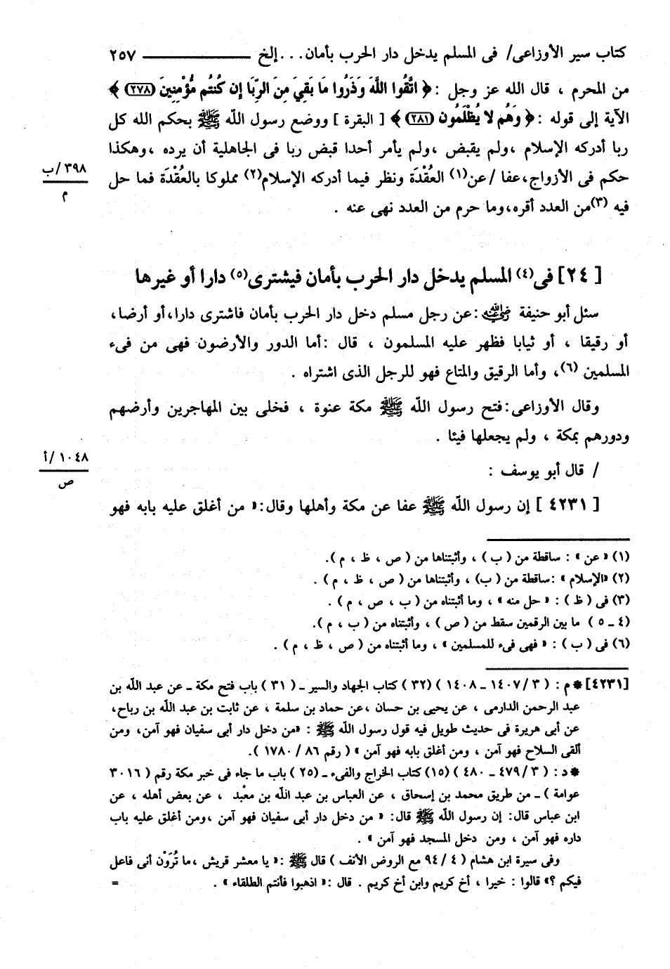 فِي الْمُسْلِمِ يَدْخُلُ دَارَ الْحَرْبِ بِأَمَانٍ فَيَشْتَرِي دَارًا أَوْ غَيْرَهَا سُئِلَ أَبُو حَنِيفَةَ رضي الله تعالى عنه عَنْ رَجُلٍ مُسْلِمٍ دَخَلَ دَارَ الْحَرْبِ بِأَمَانٍ فَاشْتَرَى دَارًا أَوْ أَرْضًا أَوْ رَقِيقًا ثِيَابًا فَظَهَرَ عَلَيْهِ الْمُسْلِمُونَ قَالَ أَمَّا الدُّورُ وَالْأَرَضُونَ فَهِيَ فَيْءٌ لِلْمُسْلِمِينَ وَأَمَّا الرَّقِيقُ وَالْمَتَاعُ فَهُوَ لِلرَّجُلِ الَّذِي اشْتَرَاهُ وَقَالَ الْأَوْزَاعِيُّ : ? فَتَحَ رَسُولُ اللَّهِ - صلى الله عليه وسلم - مَكَّةَ عَنْوَةً فَخَلَّى بَيْنَ الْمُهَاجِرِينَ وَأَرْضِهِمْ وَدُورِهِمْ بِمَكَّةَ وَلَمْ يَجْعَلْهَا فَيْئًا ? قَالَ أَبُو يُوسُفَ رحمه الله تعالى : ? إنَّ رَسُولَ اللَّهِ - صلى الله عليه وسلم - عَفَا عَنْ مَكَّةَ وَأَهْلِهَا وَقَالَ مَنْ أَغْلَقَ عَلَيْهِ بَابَهُ فَهُوَ@