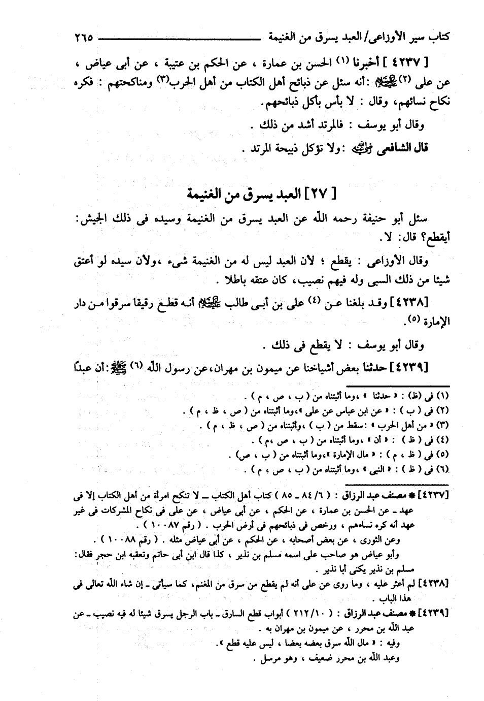 الْعَبْدُ يَسْرِقُ مِنْ الْغَنِيمَةِ سُئِلَ أَبُو حَنِيفَةَ رحمه الله تعالى عَنْ الْعَبْدِ يَسْرِقُ مِنْ الْغَنِيمَةِ وَسَيِّدُهُ فِي ذَلِكَ الْجَيْشِ أَيُقْطَعُ ؟ قَالَ : لاَ وَقَالَ الْأَوْزَاعِيُّ يُقْطَعُ لِأَنَّ الْعَبْدَ لَيْسَ لَهُ مِنْ الْغَنِيمَةِ شَيْءٌ وَلِأَنَّ سَيِّدَهُ لَوْ أَعْتَقَ شَيْئًا مِنْ ذَلِكَ السَّبْيِ وَلَهُ فِيهِمْ نَصِيبٌ كَانَ عِتْقُهُ بَاطِلاً وَقَدْ بَلَغَنَا عَنْ عَلِيِّ بْنِ أَبِي طَالِبٍ رضي الله تعالى عنه أَنَّهُ قَطَعَ رَقِيقًا سَرَقُوا مِنْ دَارِ الْإِمَارَةِ وَقَالَ أَبُو يُوسُفَ لاَ يُقْطَعُ فِي ذَلِكَ حَدَّثَنَا بَعْضُ أَشْيَاخِنَا عَنْ مَيْمُونِ بْنِ مِهْرَانَ : ? عَنْ رَسُولِ اللَّهِ - صلى الله عليه وسلم - أَنَّ عَبْدًا@