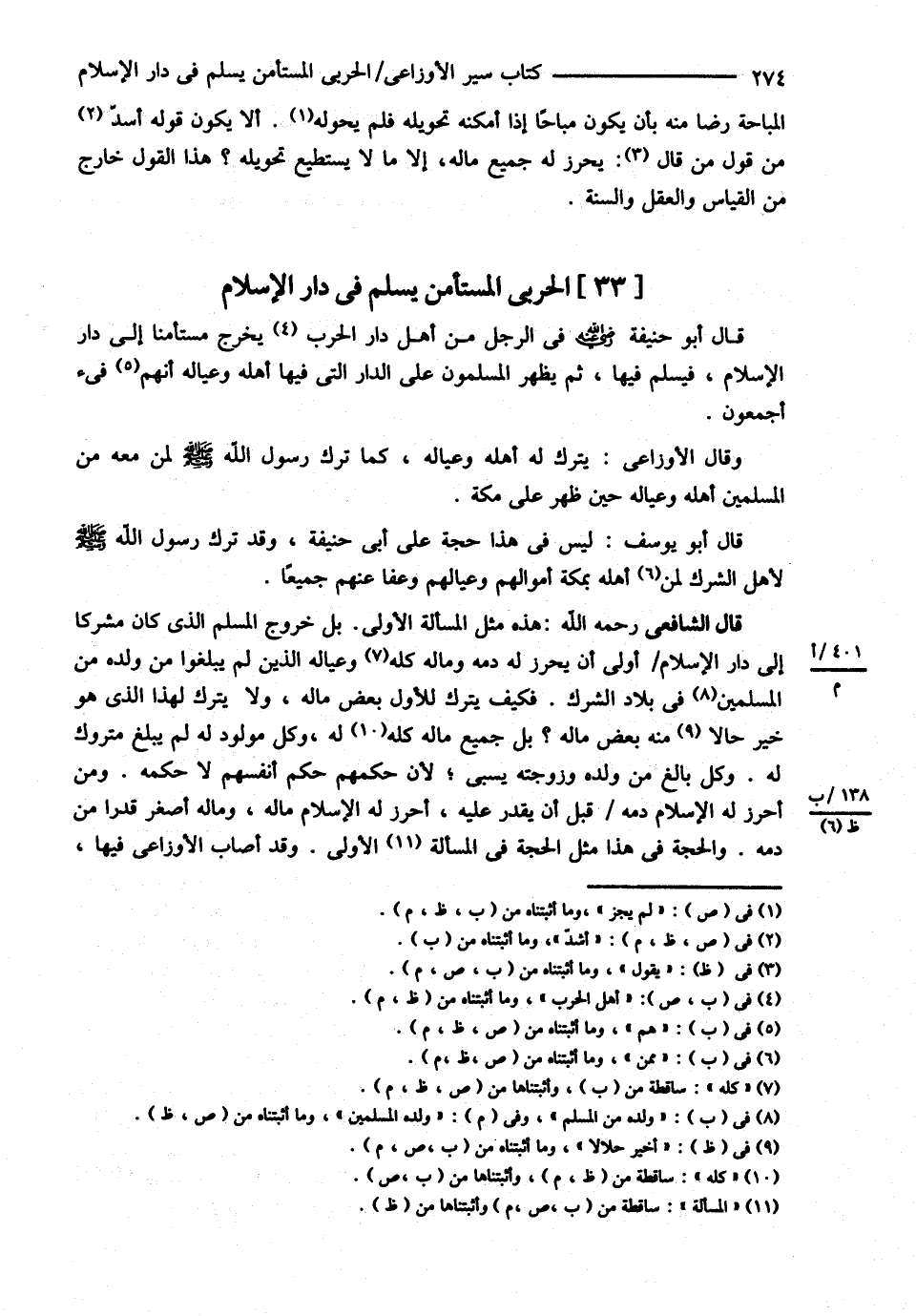 قَالَ الشَّافِعِيُّ : رحمه الله تعالى : هَذِهِ مِثْلُ الْمَسْأَلَةِ الْأُولَى بَلْ خُرُوجُ الْمُسْلِمِ الَّذِي كَانَ مُشْرِكًا إلَى دَارِ الْإِسْلاَمِ أَوْلَى أَنْ يُحْرِزَ لَهُ دَمَهُ وَمَالَهُ وَعِيَالَهُ الَّذِينَ لَمْ يَبْلُغُوا مِنْ وَلَدِهِ مِنْ الْمُسْلِمِ فِي بِلاَدِ الشِّرْكِ فَكَيْفَ يُتْرَكُ لِلْأَوَّلِ بَعْضُ مَالِهِ وَلاَ يُتْرَكُ لِهَذَا الَّذِي هُوَ خَيْرٌ حَالاً مِنْهُ بَعْضُ مَالِهِ ؟ بَلْ جَمِيعُ مَالِهِ كُلِّهِ لَهُ وَكُلُّ مَوْلُودٍ لَهُ لَمْ يَبْلُغْ مَتْرُوكٌ لَهُ وَكُلُّ بَالِغٍ مِنْ وَلَدِهِ وَزَوْجَتِهِ يُسْبَى لِأَنَّ حُكْمَهُمْ حُكْمُ أَنْفُسِهِمْ لاَ حُكْمُهُ وَمَنْ أَحْرَزَ لَهُ الْإِسْلاَمُ دَمَهُ قَبْلَ أَنْ يُقْدَرَ عَلَيْهِ أَحْرَزَ لَهُ الْإِسْلاَمُ مَالَهُ , وَمَالُهُ أَصْغَرُ قَدْرًا مِنْ دَمِهِ وَالْحُجَّةُ فِي هَذَا مِثْلُ الْحُجَّةِ فِي الْأُولَى وَقَدْ أَصَابَ الْأَوْزَاعِيُّ فِيهَا@