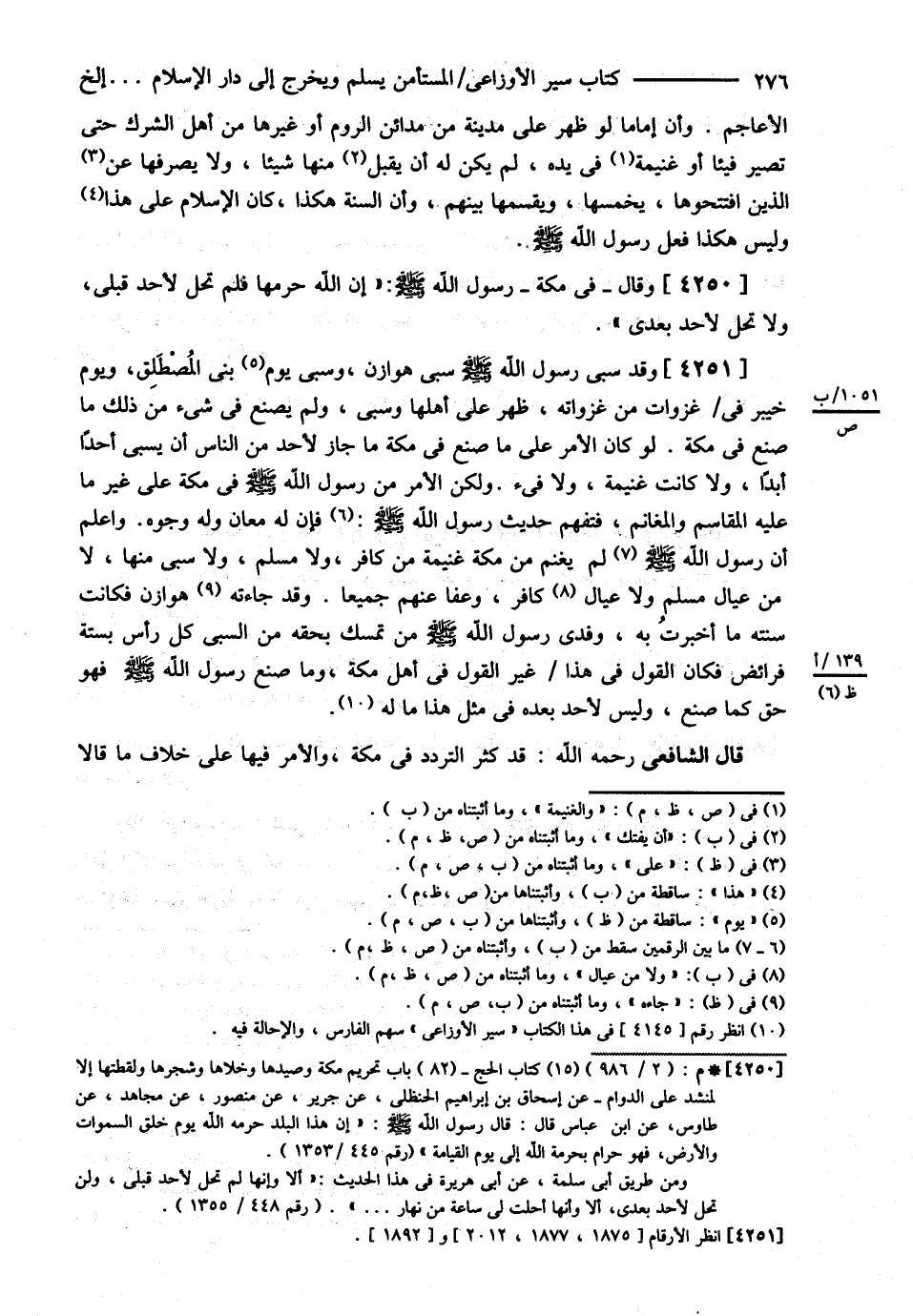 الْأَعَاجِمِ وَأَنَّ إمَامًا لَوْ ظَهَرَ عَلَى مَدِينَةٍ مِنْ مَدَائِنِ الرُّومِ أَوْ غَيْرِهَا مِنْ أَهْلِ الشِّرْكِ حَتَّى تَصِيرَ فَيْئًا أَوْ غَنِيمَةً فِي يَدِهِ لَمْ يَكُنْ لَهُ أَنْ يَفْتِكَ مِنْهَا شَيْئًا وَلاَ يَصْرِفَهَا عَنْ الَّذِينَ افْتَتَحُوهَا يُخَمِّسُهَا وَيُقَسِّمُهَا بَيْنَهُمْ وَأَنَّ السُّنَّةَ هَكَذَا كَانَ الْإِسْلاَمُ عَلَى وَلَيْسَ هَكَذَا فَعَلَ رَسُولُ اللَّهِ - صلى الله عليه وسلم - : ? وَقَالَ فِي مَكَّةَ رَسُولُ اللَّهِ - صلى الله عليه وسلم - إنَّ اللَّهَ حَرَّمَهَا فَلَمْ تَحِلَّ لِأَحَدٍ قَبْلِي وَلاَ تَحِلُّ لِأَحَدٍ بَعْدِي ? وَقَدْ سَبَى رَسُولُ اللَّهِ - صلى الله عليه وسلم - سَبْيَ هَوَازِنَ وَسَبَى يَوْمَ بَنِي الْمُصْطَلِقِ وَيَوْمَ خَيْبَرَ فِي غَزَوَاتٍ مِنْ غَزَوَاتِهِ ظَهَرَ عَلَى أَهْلِهَا وَسَبَى وَلَمْ يَصْنَعْ فِي شَيْءٍ مِنْ ذَلِكَ مَا صَنَعَ فِي مَكَّةَ لَوْ كَانَ الْأَمْرُ عَلَى مَا صَنَعَ فِي مَكَّةَ مَا جَازَ لِأَحَدٍ مِنْ النَّاسِ أَنْ يَسْبِيَ أَحَدًا أَبَدًا وَلاَ كَانَتْ غَنِيمَةٌ وَلاَ فَيْءٌ وَلَكِنَّ الْأَمْرَ مِنْ رَسُولِ اللَّهِ - صلى الله عليه وسلم - فِي مَكَّةَ عَلَى غَيْرِ مَا عَلَيْهِ الْمَقَاسِمُ وَالْمَغَانِمُ فَتَفَهَّمْ حَدِيثَ رَسُولِ اللَّهِ - صلى الله عليه وسلم - لَمْ يَغْنَمْ مِنْ مَكَّةَ غَنِيمَةً مِنْ كَافِرٍ وَلاَ مُسْلِمٍ وَلاَ سَبَى مِنْهَا لاَ مِنْ عِيَالِ مُسْلِمٍ وَلاَ مِنْ عِيَالِ كَافِرٍ وَعَفَا عَنْهُمْ جَمِيعًا وَقَدْ جَاءَتْهُ هَوَازِنُ فَكَانَتْ سُنَّتُهُ مَا أَخْبَرْتُ بِهِ وَفَدَى رَسُولُ اللَّهِ - صلى الله عليه وسلم - مَنْ تَمَسَّكَ بِحَقِّهِ مِنْ السَّبْيِ كُلُّ رَأْسٍ بِسِتَّةِ فَرَائِضَ فَكَانَ الْقَوْلُ فِي هَذَا غَيْرَ الْقَوْلِ فِي أَهْلِ مَكَّةَ وَمَا صَنَعَ رَسُولُ اللَّهِ - صلى الله عليه وسلم - فَهُوَ حَقٌّ كَمَا صَنَعَ لَيْسَ لِأَحَدٍ بَعْدَهُ فِي مِثْلِ هَذَا مَا لَهُ .