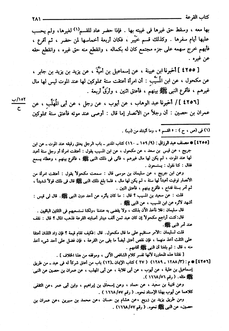 بِهَا مَعَهُ وَسَقَطَ حَقُّ غَيْرِهَا فِي غَيْبَتِهِ بِهَا , فَإِذَا حَضَرَ عَادَ لِلْقَسْمِ لِغَيْرِهَا , وَلَمْ يَحْسِبْ عَلَيْهَا أَيَّامَ سَفَرِهَا . وَكَذَلِكَ قَسَّمَ خَيْبَرَ فَكَانَ أَرْبَعَةُ أَخْمَاسِهَا لِمَنْ حَضَرَ , ثُمَّ أَقْرَعَ , فَأَيُّهُمْ خَرَجَ سَهْمُهُ عَلَى جُزْءٍ مُجْتَمِعٍ كَانَ لَهُ بِكَمَالِهِ وَانْقَطَعَ مِنْهُ حَقُّ غَيْرِهِ وَانْقَطَعَ حَقُّهُ عَنْ غَيْرِهِ ( أَخْبَرَنَا ) ابْنُ عُيَيْنَةَ عَنْ إسْمَاعِيلَ بْنِ أُمَيَّةَ عَنْ يَزِيدَ بْنِ يَزِيدَ بْنِ جَابِرٍ عَنْ مَكْحُولٍ عَنْ ابْنِ الْمُسَيِّبِ : ? أَنَّ امْرَأَةً أَعْتَقَتْ سِتَّةَ مَمْلُوكِينَ لَهَا عِنْدَ الْمَوْتِ لَيْسَ لَهَا مَالٌ غَيْرَهُمْ , فَأَقْرَعَ النَّبِيُّ - صلى الله عليه وسلم - بَيْنَهُمْ , فَأَعْتَقَ اثْنَيْنِ وَأَرَقَّ أَرْبَعَةً ? , أَخْبَرَنَا عَبْدُ الْوَهَّابِ عَنْ أَيُّوبَ عَنْ رَجُلٍ عَنْ أَبِي الْمُهَلَّبِ عَنْ عِمْرَانَ بْنِ حُصَيْنٍ : ? أَنَّ رَجُلاً مِنْ الْأَنْصَارِ إمَّا قَالَ : أَوْصَى عِنْدَ مَوْتِهِ فَأَعْتَقَ سِتَّةَ مَمْلُوكِينَ@