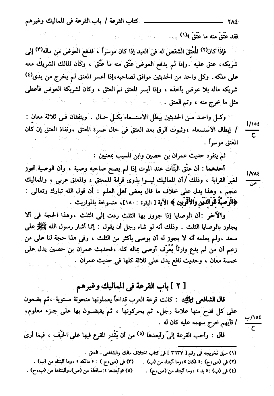 فَقَدْ عَتَقَ مِنْهُ مَا عَتَقَ ? , فَإِذَا كَانَ الْمُعْتِقُ الشِّقْصَ لَهُ فِي الْعَبْدِ إذَا كَانَ مُوسِرًا فَدَفَعَ الْعِوَضَ مِنْ مَالِهِ إلَى شَرِيكِهِ عَتَقَ عَلَيْهِ . وَإِذَا لَمْ يَدْفَعْ الْعِوَضَ عَتَقَ مِنْهُ مَا عَتَقَ , وَكَانَ الْمَالِكُ الشَّرِيكُ مَعَهُ عَلَى مِلْكِهِ , وَكُلُّ وَاحِدٍ مِنْ الْحَدِيثَيْنِ مُوَافِقٌ لِصَاحِبِهِ , إذَا أَعْسَرَ الْمُعْتِقُ لَمْ يَخْرُجْ مِنْ يَدِ شَرِيكِهِ مَالُهُ بِلاَ عِوَضٍ يَأْخُذُهُ , وَإِذَا أَيْسَرَ الْمُعْتِقُ تَمَّ الْعِتْقُ , وَكَانَ لِشَرِيكِهِ الْعِوَضُ , فَأُعْطِيَ مِثْلَ مَا خَرَجَ مِنْهُ وَتَمَّ الْعِتْقُ , وَكُلُّ وَاحِدٍ مِنْ الْحَدِيثَيْنِ يُبْطِلُ الِاسْتِسْعَاءَ بِكُلِّ حَالٍ , وَيَتَّفِقَانِ فِي ثَلاَثَةِ مَعَانٍ : إبْطَالُ الِاسْتِسْعَاءِ , وَثُبُوتُ الرِّقِّ بَعْدَ الْعِتْقِ فِي حَالِ عُسْرَةِ الْمُعْتِقِ , وَنَفَاذُ الْعِتْقِ إنْ كَانَ الْمُعْتِقُ مُوسِرًا , ثُمَّ يَنْفَرِدُ حَدِيثُ عِمْرَانَ بْنِ حُصَيْنٍ وَابْنِ الْمُسَيِّبِ بِمَعْنَيَيْنِ : أَحَدُهُمَا , أَنَّ عِتْقَ الْبَتَاتِ عِنْدَ الْمَوْتِ إذَا لَمْ يَصِحَّ صَاحِبُهُ وَصِيَّةٌ , وَأَنَّ الْوَصِيَّةَ تَجُوزُ لِغَيْرِ الْقَرَابَةِ , وَلَك أَنَّ الْمَمَالِيكَ لَيْسُوا بِذَوِي قَرَابَةٍ لِلْمُعْتِقِ , وَالْمُعْتِقُ عَرَبِيٌّ وَالْمَمَالِيكُ عَجَمٌ , وَهَذَا يَدُلُّ عَلَى خِلاَفِ مَا قَالَ بَعْضُ أَهْلِ الْعِلْمِ أَنَّ قَوْلَ اللَّهِ تَبَارَكَ وَتَعَالَى : : ? الْوَصِيَّةُ لِلْوَالِدَيْنِ وَالْأَقْرَبِينَ ? مَنْسُوخَةٌ بِالْمَوَارِيثِ وَالْآخَرُ , أَنَّ الْوَصَايَا إذَا جُوِّزَ بِهَا الثُّلُثُ رُدَّتْ إلَى الثُّلُثِ , وَهَذِهِ الْحُجَّةُ فِي أَنْ لاَ يُجَاوَزَ بِالْوَصَايَا الثُّلُثُ , وَذَلِكَ أَنَّهُ لَوْ شَاءَ رَجُلٌ أَنْ يَقُولَ : إنَّمَا أَشَارَ رَسُولُ اللَّهِ - صلى الله عليه وسلم - عَلَى سَعْدٍ وَلَمْ يُعْلِمْهُ أَنَّهُ لاَ يَجُوزُ لَهُ أَنْ يُوصِيَ بِأَكْثَرَ مِنْ الثُّلُثِ , وَفِي هَذَا حُجَّةٌ لَنَا عَلَى مَنْ زَعَمَ أَنَّ مَنْ لَمْ يَدَعْ وَارِثًا يُعْرَفُ أَوْصَى بِمَالِهِ كُلِّهِ , فَحَدِيثُ عِمْرَانَ بْنِ حُصَيْنٍ يَدُلُّ عَلَى خَمْسَةِ مَعَانٍ , وَحَدِيثُ نَافِعٍ يَدُلُّ عَلَى ثَلاَثَةٍ كُلُّهَا فِي حَدِيثِ عِمْرَانَ .