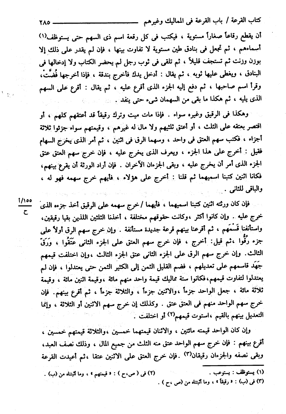 أَنْ يَقْطَعَ رِقَاعًا صِغَارًا مُسْتَوِيَةً , فَيَكْتُبُ فِي كُلِّ رُقْعَةٍ اسْمَ ذِي السَّهْمِ , حَتَّى يَسْتَوْظِفَ أَسْمَاءَهُمْ , ثُمَّ تُجْعَلُ فِي بَنَادِقَ طِينٍ مُسْتَوِيَةٍ لاَ تَفَاوُتَ بَيْنَهَا , فَإِنْ لَمْ يَقْدِرْ عَلَى ذَلِكَ إلَّا بِوَزْنٍ وُزِنَتْ , ثُمَّ تُسْتَجَف قَلِيلاً ثُمَّ تُلْقَى فِي ثَوْبِ رَجُلٍ لَمْ يَحْضُرْ الْكِتَابَ وَلاَ إدْخَالَهَا فِي الْبَنَادِقِ وَيُغَطَّى عَلَيْهَا ثَوْبُهُ ثُمَّ يُقَالُ : أَدْخِلْ يَدَك فَأَخْرِجْ بُنْدُقَةً , فَإِذَا أَخْرَجَهَا فُضَّتْ وَقَرَأَ اسْمَ صَاحِبِهَا ثُمَّ دَفَعَ إلَيْهِ الْجُزْءَ الَّذِي أَقْرَعَ عَلَيْهِ , ثُمَّ يُقَالُ : أُقْرِعَ عَلَى السَّهْمِ الَّذِي يَلِيه , ثُمَّ هَكَذَا مَا بَقِيَ مِنْ السُّهْمَانِ شَيْءٌ حَتَّى يَنْفَدَ . وَهَكَذَا فِي الرَّقِيقِ وَغَيْرِهِ سَوَاءٌ , فَإِذَا مَاتَ مَيِّتٌ وَتَرَكَ رَقِيقًا قَدْ أَعْتَقَهُمْ كُلَّهُمْ , أَوْاقْتَصَرَ بِعِتْقِهِ عَلَى الثُّلُثِ , أَوْ أَعْتَقَ ثُلُثَيْهِمْ وَلاَ مَالَ لَهُ غَيْرُهُمْ وَقِيمَتُهُمْ سَوَاءٌ , جُزِّئُوا ثَلاَثَةَ أَجْزَاءٍ فَكَتَبَ سَهْمَ الْعِتْقِ فِي وَاحِدٍ وَسَهْمَا الرِّقِّ فِي اثْنَيْنِ ثُمَّ أَمَرَ الَّذِي يُخْرِجُ السِّهَامَ فَقِيلَ : أَخْرِجْ عَلَى هَذَا الْجُزْءِ وَيُعَرَّفُ الَّذِي يَخْرُجُ عَلَيْهِ , فَإِنْ خَرَجَ سَهْمُ الْعِتْقِ عَتَقَ الْجُزْءُ الَّذِي أَمَرَ أَنْ يَخْرُجَ عَلَيْهِ وَبَقِيَ الْجُزْءَانِ الْآخَرَانِ , فَإِنْ أَرَادَ الْوَرَثَةُ أَنْ يُقْرَعَ بَيْنَهُمْ , فَكَانَا اثْنَيْنِ كَتَبْنَا اسْمَيْهِمَا ثُمَّ قُلْنَا : أَخْرِجْ عَلَى هَؤُلاَءِ فَأَيُّهُمْ خَرَجَ سَهْمُهُ فَهُوَ لَهُ وَالْبَاقِي لِلثَّانِي , فَإِنْ كَانَ وَرَثَتُهُ اثْنَيْنِ كَتَبْنَا اسْمَيْهِمَا , فَأَيُّهُمَا خَرَجَ سَهْمُهُ عَلَى الرَّقِيقِ أَخَذَ جُزْأَهُ الَّذِي خَرَجَ عَلَيْهِ , وَإِنْ كَانُوا أَكْثَرَ وَكَانَتْ حُقُوقُهُمْ مُخْتَلِفَةً أَخَذْنَا الثُّلُثَيْنِ اللَّذَيْنِ بَقِيَا رَقِيقَيْنِ وَاسْتَأْنَفْنَا فَأَقْرَعْنَا ثُمَّ أَقْرَعْنَا بَيْنَهُمْ قُرْعَةً جَدِيدَةً مُسْتَأْنَفَةً , وَإِنْ خَرَجَ سَهْمُ الرِّقِّ أَوَّلاً عَلَى جُزْءٍ رَقُّوا , ثُمَّ قِيلَ أَخْرِجْ , فَإِنْ خَرَجَ سَهْمُ الْعِتْقِ عَلَى الْجُزْءِ الثَّانِي عَتَقُوا وَرَقَّ الثَّالِثُ , وَإِنْ خَرَجَ سَهْمُ الرِّقِّ عَلَى الْجُزْءِ الثَّانِي عَتَقَ الْجُزْءُ الثَّالِثُ وَإِنْ اخْتَلَفَتْ قِيَمُهُمْ جَهَدَ قَاسِمُهُمْ عَلَى تَعْدِيلِهِمْ , فَضَمَّ الْقَلِيلَ الثَّمَنِ إلَى الْكَثِيرِ الثَّمَنِ حَتَّى يَعْتَدِلُوا , فَإِنْ لَمْ يَعْتَدِلُوا لِتَفَاوُتِ قِيَمِهِمْ فَكَانُوا سِتَّةَ مَمَالِيكَ قِيمَةُ وَاحِدٍ مِنْهُمْ مِائَةٌ وَقِيمَةُ اثْنَيْنِ مِائَةٌ وَقِيمَةُ ثَلاَثَةٍ مِائَةٌ , جَعَلَ الْوَاحِدَ جُزْءًا وَالِاثْنَيْنِ جُزْءًا وَالثَّلاَثَةَ جُزْءًا , ثُمَّ أَقْرَعَ بَيْنَهُمْ , فَإِنْ خَرَجَ سَهْمُ الْوَاحِدِ مِنْهُمْ فِي الْعِتْقِ عَتَقَ . وَكَذَلِكَ إنْ خَرَجَ سَهْمُ الِاثْنَيْنِ , أَوْ الثَّلاَثَةِ وَإِنَّمَا التَّعْدِيلُ بَيْنَهُمْ بِالْقِيَمِ اسْتَوَتْ قِيَمُهُمْ , أَوْ اخْتَلَفَتْ , وَإِنْ كَانَ الْوَاحِدُ قِيمَتُهُ مِائَتَانِ وَالِاثْنَانِ قِيمَتُهُمَا خَمْسُونَ وَالثَّلاَثَةُ قِيمَتُهُمْ خَمْسُونَ أَقْرَعَ بَيْنَهُمْ فَإِنْ خَرَجَ سَهْمُ الْوَاحِدِ عَتَقَ مِنْهُ الثُّلُثُ مِنْ جَمِيعِ الْمَالِ وَذَلِكَ نِصْفُ الْعَبْدِ وَبَقِيَ نِصْفُهُ وَالْجُزْءَانِ رَقِيقًا , فَإِنْ خَرَجَ الْعِتْقُ عَلَى الِاثْنَيْنِ عَتَقَا , ثُمَّ أُعِيدَتْ الْقُرْعَةُ ,@