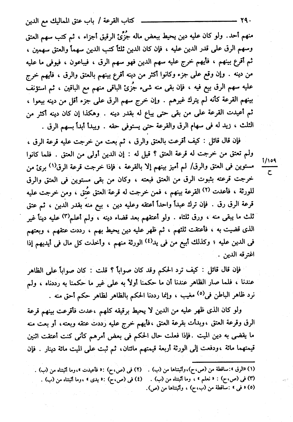 مِنْهُمْ أَحَدٌ وَلَوْ كَانَ عَلَيْهِ دَيْنٌ يُحِيطُ بِبَعْضِ مَالِهِ جُزِّئَ الرَّقِيقُ أَجْزَاءً , ثُمَّ كُتِبَ سَهْمُ الْعِتْقِ وَسَهْمُ الرِّقِّ عَلَى قَدْرِ الدَّيْنِ عَلَيْهِ , فَإِنْ كَانَ الدَّيْنُ ثُلُثًا كُتِبَ الدَّيْنُ سَهْمًا وَالْعِتْقُ سَهْمَيْنِ , ثُمَّ أُقْرِعَ بَيْنَهُمْ فَأَيُّهُمْ خَرَجَ عَلَيْهِ سَهْمُ الدَّيْنِ فَهُوَ سَهْمُ الرِّقِّ فَيُبَاعُونَ فَيُوَفَّى مَا عَلَيْهِ مِنْ دَيْنِهِ , وَإِنْ وَقَعَ عَلَى جُزْءٍ وَكَانُوا أَكْثَرَ مِنْ دَيْنِهِ أُقْرِعَ بَيْنَهُمْ بِالْعِتْقِ وَالرِّقِّ فَأَيُّهُمْ خَرَجَ عَلَيْهِ سَهْمُ الرِّقِّ بِيعَ فِيهِ , فَإِنْ بَقِيَ مِنْهُ شَيْءٌ جُزِّئَ الْبَاقِي مِنْهُمْ مَعَ الْبَاقِينَ , ثُمَّ اُسْتُؤْنِفَ بَيْنَهُمْ الْقُرْعَةُ , كَأَنَّهُ لَمْ يَتْرُكْ غَيْرَهُمْ , وَإِنْ خَرَجَ سَهْمُ الرِّقِّ عَلَى جُزْءٍ أَقَلَّ مِنْ دَيْنِهِ بِيعُوا , ثُمَّ أُعِيدَتْ الْقُرْعَةُ عَلَى مَنْ بَقِيَ حَتَّى يُبَاعَ لَهُ بِقَدْرِ دَيْنِهِ وَهَكَذَا إنْ كَانَ دَيْنُهُ أَكْثَرَ مِنْ الثُّلُثِ زِيدَ لَهُ فِي سِهَامِ الرِّقِّ وَالْقُرْعَةِ حَتَّى يَسْتَوْفِيَ حَقَّهُ وَيُبْدَأُ أَبَدًا بِسَهْمِ الرِّقِّ , فَإِنْ قَالَ قَائِلٌ : كَيْفَ أَقْرَعْت بِالْعِتْقِ وَالرِّقِّ , ثُمَّ بِعْت مَنْ خَرَجَتْ عَلَيْهِ قُرْعَةُ الرِّقِّ وَلَمْ تَعْتِقْ مَنْ خَرَجَتْ لَهُ قُرْعَةُ الْعِتْقِ ؟ قِيلَ لَهُ إنَّ الدَّيْنَ أَوْلَى مِنْ الْعِتْقِ , فَلَمَّا كَانُوا مُسْتَوِينَ فِي الْعِتْقِ وَالرِّقِّ لَمْ أُمَيِّزْ بَيْنَهُمْ إلَّا بِالْقُرْعَةِ . فَإِذَا خَرَجْت قُرْعَةُ الرِّقِّ بَرِئَ مَنْ خَرَجَتْ قُرْعَتُهُ بِثُبُوتِ الرِّقِّ مِنْ الْعِتْقِ فَبِعْته , وَكَانَ مَنْ بَقِيَ مُسْتَوِينَ فِي الْعِتْقِ وَالرِّقِّ لِلْوَرَثَةِ فَأَعَدْت الْقُرْعَةَ بَيْنَهُمْ فَمَنْ خَرَجَتْ لَهُ قُرْعَةُ الْعِتْقِ عَتَقَ وَمَنْ خَرَجَتْ عَلَيْهِ قُرْعَةُ الرِّقِّ رَقَّ فَإِنْ تَرَكَ عَبْدًا وَاحِدًا أَعْتَقَهُ وَعَلَيْهِ دَيْنٌ بِيعَ مِنْهُ بِقَدْرِ الدَّيْنِ , ثُمَّ عَتَقَ ثُلُثُ مَا يَبْقَى مِنْهُ وَرَقَّ ثُلُثَاهُ وَلَوْ أَعْتَقَهُمْ بَعْدَ قَضَاءِ دَيْنِهِ وَلَمْ أَعْلَمْ عَلَيْهِ دَيْنًا غَيْرَ الَّذِي قَضَيْت بِهِ فَأَعْتَقْت ثُلُثَهُمْ , ثُمَّ ظَهَرَ عَلَيْهِ دَيْنٌ يُحِيطُ بِهِمْ رَدَدْت عِتْقَهُمْ وَبِعْتُهُمْ فِي الدَّيْنِ عَلَيْهِ , وَكَذَلِكَ أَبِيعُ مَنْ فِي يَدِ الْوَرَثَةِ مِنْهُمْ وَأَخَذْت كُلَّ مَالٍ فِي أَيْدِيهمْ إذَا اغْتَرَقَهُ الدَّيْنُ , فَإِنْ قَالَ قَائِلٌ : كَيْفَ تَرُدُّ الْحُكْمَ وَقَدْ كَانَ صَوَابًا ؟ قُلْت : كَانَ صَوَابًا عَلَى الظَّاهِرِ عِنْدَنَا , فَلَمَّا صَارَ الظَّاهِرُ عِنْدَنَا أَنَّ مَا حَكَمْنَا أَوَّلاً بِهِ عَلَى غَيْرِ مَا حَكَمْنَا بِهِ رَدَدْنَاهُ وَلَمْ نَرُدَّ ظَاهِرًا لِبَاطِنٍ مُغَيَّبٍ , وَإِنَّمَا رَدَدْنَا الْحُكْمَ بِالظَّاهِرِ لِظَاهِرِ حُكْمٍ أَحَقَّ مِنْهُ وَلَوْ كَانَ الَّذِي ظَهَرَ عَلَيْهِ مِنْ الدَّيْنِ لاَ يُحِيطُ بِرَقِيقِهِ كُلِّهِمْ عُدْتُ فَأَقْرَعْتُ بَيْنَهُمْ قُرْعَةَ الرِّقِّ وَقُرْعَةَ الْعِتْقِ وَبَدَأْتُ بِقُرْعَةِ الْعِتْقِ , فَأَيُّهُمْ خَرَجَ عَلَيْهِ رَدَدْت عِتْقَهُ وَبِعْتُهُ , أَوْ بِعْت مِنْهُ مَا يُقْضَى بِهِ دَيْنُ الْمَيِّتِ , فَإِذَا فَعَلْتَ حَالَ الْحُكْمِ فِي بَعْضِ أَمْرِهِمْ كَأَنْ كُنْتَ أَعْتَقْتَ اثْنَيْنِ قِيمَتُهُمَا مِائَةٌ وَدَفَعْت إلَى الْوَرَثَةِ أَرْبَعَةً قِيمَتُهُمْ مِائَتَانِ , ثُمَّ ثَبَتَ عَلَى الْمَيِّتِ مِائَةُ دِينَارٍ , فَإِنْ@
