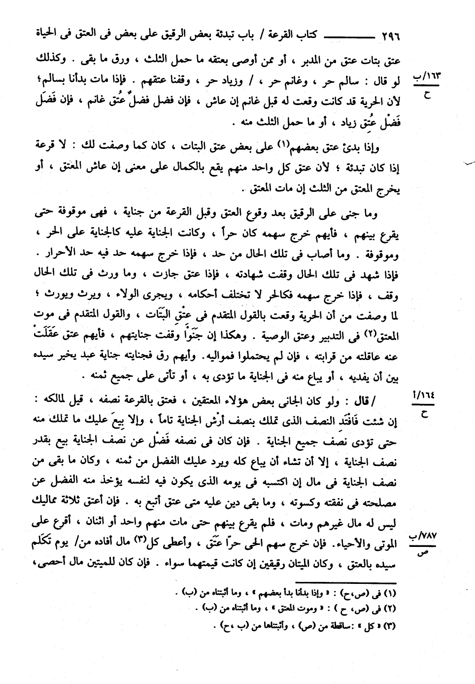 عِتْقَ بَتَاتٍ عَتَقَ مِنْ الْمُدَبَّرِ أَوْ مِمَّنْ أَوْصَى بِعِتْقِهِ مَا حَمَلَ الثُّلُثُ وَرَقَّ مَا بَقِيَ , وَكَذَلِكَ لَوْ قَالَ : سَالِمٌ حُرٌّ وَغَانِمٌ حُرٌّ وَزِيَادٌ حُرٌّ وَقَفْنَا عِتْقَهُمْ , فَإِذَا مَاتَ بَدَأْنَا بِسَالِمٍ ; لِأَنَّ الْحُرِّيَّةَ قَدْ كَانَتْ وَقَعَتْ لَهُ قَبْلَ غَانِمٍ إنْ عَاشَ , فَإِنْ فَضَلَ فَضْلٌ عَتَقَ غَانِمٌ , فَإِنْ فَضَلَ فَضْلٌ عَتَقَ زِيَادٌ , أَوْ مَا حَمَلَ الثُّلُثُ مِنْهُ وَإِذَا بُدِئَ عِتْقُ بَعْضِهِمْ عَلَى بَعْضٍ عِتْقَ الْبَتَاتُ كَانَ كَمَا وَصَفْت لَك لاَ قُرْعَةَ إذَا كَانَ تَبْدِئَةً ; لِأَنَّ عِتْقَ كُلِّ وَاحِدٍ مِنْهُمْ يَقَعُ بِالْكَمَالِ عَلَى مَعْنَى إنْ عَاشَ الْمُعْتِقُ أَوْ يَخْرُجُ الْمُعْتَقُ مِنْ الثُّلُثِ إنْ مَاتَ الْمُعْتِقُ , وَمَا جَنَى عَلَى الرَّقِيقِ بَعْدَ وُقُوعِ الْعِتْقِ وَقَبْلَ الْقُرْعَةِ مِنْ جِنَايَةِ فَهِيَ مَوْقُوفَةٌ حَتَّى يُقْرَعَ بَيْنَهُمْ , فَأَيُّهُمْ خَرَجَ سَهْمُهُ كَانَ حُرًّا وَكَانَتْ الْجِنَايَةُ عَلَيْهِ كَالْجِنَايَةِ عَلَى الْحُرِّ , وَمَوْقُوفَةٌ وَمَا أَصَابَ فِي تِلْكَ الْحَالِ مِنْ حَدٍّ , فَإِذَا خَرَجَ سَهْمُهُ حُدَّ فِيهِ حَدُّ الْأَحْرَارِ , فَإِذَا شَهِدَ فِي تِلْكَ الْحَالِ وُقِفَتْ شَهَادَتُهُ , فَإِذَا عَتَقَ جَازَتْ , وَمَا وَرِثَ فِي تِلْكَ الْحَالِ وُقِفَ , فَإِذَا خَرَجَ سَهْمُهُ فَكَالْحُرِّ لاَ تَخْتَلِفُ أَحْكَامُهُ وَيَجْرِي الْوَلاَءُ وَيَرِثُ وَيُورَثُ لِمَا وَصَفْت مِنْ أَنَّ الْحُرِّيَّةَ وَقَعَتْ بِالْقَوْلِ الْمُتَقَدِّمِ فِي عِتْقِ الْبَتَاتِ , وَالْقَوْلُ الْمُتَقَدِّمُ فِي مَوْتِ الْمُعْتَقِ فِي التَّدْبِيرِ وَعِتْقِ الْوَصِيَّةِ وَهَكَذَا إنْ جَنَوْا وُقِفَتْ جِنَايَتُهُمْ , فَأَيُّهُمْ عَتَقَ عَقَلَتْ عَنْهُ عَاقِلَتُهُ مِنْ قَرَابَتِهِ , فَإِنْ لَمْ يَحْتَمِلُوا فَمَوَالِيه , وَأَيُّهُمْ رَقَّ فَجِنَايَتُهُ جِنَايَةُ . عَبْدٍ يُخَيَّرُ سَيِّدُهُ بَيْنَ أَنْ يَفْدِيَهُ , أَوْ يُبَاعَ مِنْهُ فِي الْجِنَايَةِ مَا تُؤَدَّى بِهِ , أَوْ تَأْتِي عَلَى جَمِيعِ ثَمَنِهِ ( قَالَ ) : وَلَوْ كَانَ الْجَانِي بَعْضُ هَؤُلاَءِ الْمُعْتَقِينَ , فَعَتَقَ بِالْقُرْعَةِ نِصْفُهُ قِيلَ لِمَالِكِهِ إنْ شِئْت فَاقْتَدِ النِّصْفَ الَّذِي تَمْلِكُ بِنِصْفِ أَرْشِ الْجِنَايَةِ تَامًّا وَإِلَّا بِيعَ عَلَيْك مَا تَمْلِكُ مِنْهُ حَتَّى تُؤَدِّيَ نِصْفَ جَمِيعِ الْجِنَايَةِ , فَإِنْ كَانَ فِي نِصْفِهِ فَضْلٌ عَنْ نِصْفِ الْجِنَايَةِ بِيعَ بِقَدْرِ نِصْفِ الْجِنَايَةِ إلَّا أَنْ تَشَاءَ أَنْ يُبَاعَ كُلُّهُ وَيُرَدَّ عَلَيْك الْفَضْلُ مِنْ ثَمَنِهِ وَكَانَ مَا بَقِيَ مِنْ نِصْفِ الْجِنَايَةِ فِي مَالٍ إنْ اكْتَسَبَهُ فِي يَوْمِهِ الَّذِي يَكُونُ فِيهِ لِنَفْسِهِ يُؤْخَذُ مِنْهُ الْفَضْلُ عَنْ مَصْلَحَتِهِ فِي نَفَقَتِهِ وَكِسْوَتِهِ وَمَا بَقِيَ دَيْنٌ عَلَيْهِ مَتَى عَتَقَ اُتُّبِعَ بِهِ , فَإِنْ أَعْتَقَ ثَلاَثَةَ مَمَالِيكَ لَيْسَ لَهُ مَالٌ غَيْرَهُمْ وَمَاتَ فَلَمْ يُقْرِعْ بَيْنَهُمْ حَتَّى مَاتَ مِنْهُمْ وَاحِدٌ , أَوْ اثْنَانِ أُقْرِعَ عَلَى الْمَوْتَى وَالْأَحْيَاءِ , فَإِنْ خَرَجَ سَهْمُ الْحَيِّ حُرًّا عَتَقَ وَأَعْطَى كُلَّ مَالٍ أَفَادَهُ مِنْ يَوْمِ تَكَلَّمَ سَيِّدُهُ بِالْعِتْقِ وَكَانَ الْمَيِّتَانِ رَقِيقَيْنِ إنْ كَانَتْ قِيمَتُهُمَا سَوَاءً , فَإِنْ كَانَ لِلْمَيِّتَيْنِ مَالٌ أُحْصِيَ , @