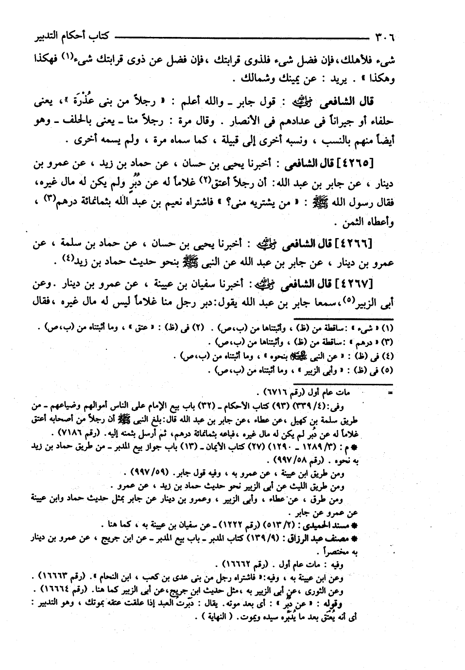قَالَ الشَّافِعِيُّ : : أَخْبَرَنَا يَحْيَى بْنُ حَسَّانَ عَنْ حَمَّادِ بْنِ زَيْدٍ عَنْ عَمْرِو بْنِ دِينَارٍ عَنْ جَابِرِ بْنِ عَبْدِ اللَّهِ : ? أَنَّ رَجُلاً أَعْتَقَ غُلاَمًا لَهُ عَنْ دَبْرٍ وَلَمْ يَكُنْ لَهُ مَالٌ غَيْرُهُ , فَقَالَ @