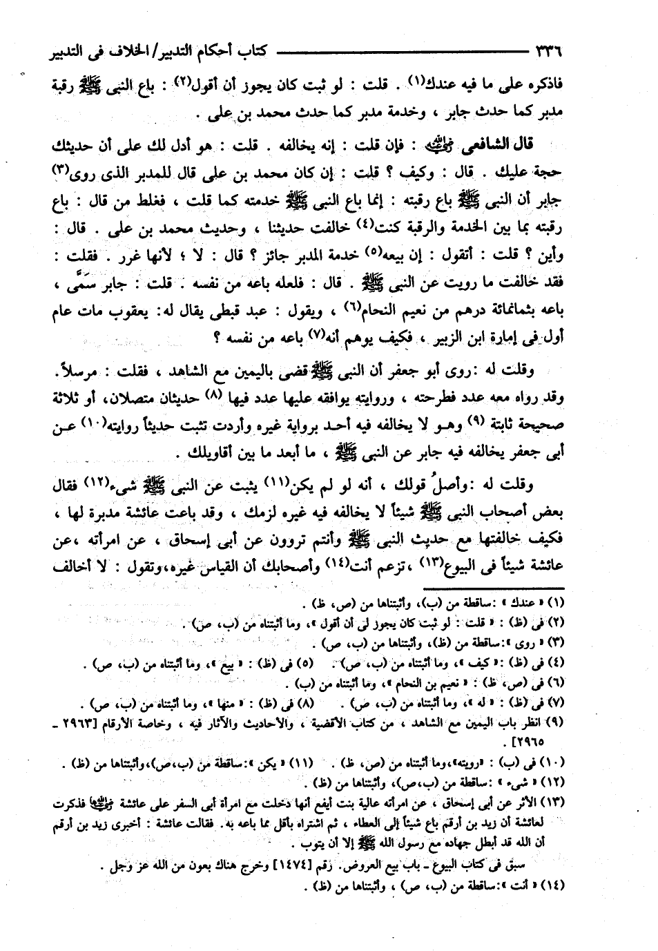 قَالَ الشَّافِعِيُّ : : فَإِنْ قُلْت : إنَّهُ يُخَالِفُهُ , قُلْت : هُوَ أَدَلُّ لَك عَلَى أَنَّ حَدِيثَك حُجَّةٌ عَلَيْك , قَالَ : وَكَيْفَ ؟ قُلْت : إنْ كَانَ مُحَمَّدُ بْنُ عَلِيٍّ قَالَ لِلْمُدَبَّرِ الَّذِي رَوَى جَابِرٌ أَنَّ النَّبِيَّ - صلى الله عليه وسلم - بَاعَ رَقَبَتَهُ إنَّمَا بَاعَ النَّبِيُّ - صلى الله عليه وسلم - خِدْمَتَهُ كَمَا قُلْت فَغَلِطَ مَنْ قَالَ بَاعَ رَقَبَتَهُ بِمَا بَيْنَ الْخِدْمَةِ وَالرَّقَبَةِ كُنْت خَالَفْت حَدِيثَنَا وَحَدِيثَ مُحَمَّدِ بْنِ عَلِيٍّ , قَالَ : وَأَيْنَ ؟ قُلْت : أَتَقُولُ : إنَّ بَيْعَهُ خِدْمَةَ الْمُدَبَّرِ جَائِزٌ , قَالَ : لاَ ; لِأَنَّهَا غَرَرٌ فَقُلْت : فَقَدْ خَالَفْت مَا رَوَيْت عَنْ النَّبِيِّ - صلى الله عليه وسلم - قَالَ : فَلَعَلَّهُ بَاعَهُ مِنْ نَفْسِهِ قُلْت : جَابِرٌ سَمَّى بَاعَهُ بِثَمَانِمِائَةِ دِرْهَمٍ مِنْ نُعَيْمٍ النَّحَّامِ , وَيَقُولُ : عَبْدٌ قِبْطِيٌّ يُقَالُ لَهُ يَعْقُوبُ مَاتَ عَامَ أَوَّلٍ فِي إمَارَةِ ابْنِ الزُّبَيْرِ , فَكَيْفَ يُوهَمُ أَنَّهُ بَاعَهُ مِنْ نَفْسِهِ ؟ وَقُلْت لَهُ : رَوَى أَبُو جَعْفَرٍ : ? أَنَّ النَّبِيَّ - صلى الله عليه وسلم - قَضَى بِالْيَمِينِ مَعَ الشَّاهِدِ ? فَقُلْت : مُرْسَلاً , وَقَدْ رَوَاهُ مَعَهُ عَدَدٌ فَطَرَحْته وَرِوَايَتُهُ يُوَافِقُهُ عَلَيْهَا عَدَدٌ . فِيهَا حَدِيثَانِ مُتَّصِلاَنِ , أَوْ ثَلاَثَةٌ صَحِيحَةٌ ثَابِتَةٌ وَهُوَ لاَ يُخَالِفُهُ فِيهِ أَحَدٌ بِرِوَايَةِ غَيْرِهِ وَأَرَدْت تُثْبِتُ حَدِيثًا رَوَيْته عَنْ أَبِي جَعْفَرٍ يُخَالِفُهُ فِيهِ جَابِرٌ عَنْ النَّبِيِّ - صلى الله عليه وسلم - مَا أَبْعَدَ مَا بَيْنَ أَقَاوِيلِك , وَقُلْت لَهُ : وَأَصْلُ قَوْلِك أَنَّهُ لَوْ لَمْ يَثْبُتْ عَنْ النَّبِيِّ - صلى الله عليه وسلم - فَقَالَ بَعْضُ أَصْحَابِ النَّبِيِّ - صلى الله عليه وسلم - شَيْئًا لاَ يُخَالِفُهُ فِيهِ غَيْرُهُ لَزِمَك , وَقَدْ بَاعَتْ عَائِشَةُ مُدَبَّرَةً لَهَا فَكَيْفَ خَالَفْتهَا مَعَ حَدِيثِ النَّبِيِّ - صلى الله عليه وسلم - وَأَنْتُمْ رَاوُونَ عَنْ أَبِي إِسْحَاقَ عَنْ امْرَأَتِهِ عَنْ عَائِشَةَ شَيْئًا فِي الْبُيُوعِ تَزْعُمُ وَأَصْحَابُك أَنَّ الْقِيَاسَ غَيْرُهُ وَتَقُولُ : لاَ أُخَالِفُ@