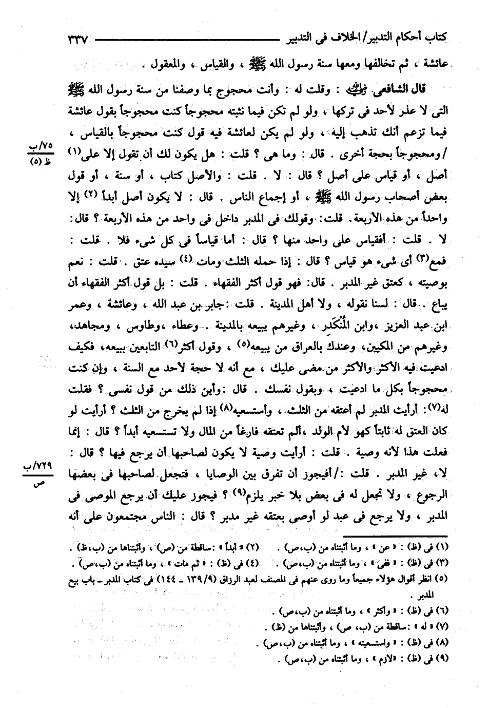 قَالَ الشَّافِعِيُّ : : وَقُلْت لَهُ : وَأَنْتَ مَحْجُوجٌ بِمَا وَصَفْنَا مِنْ سُنَّةِ رَسُولِ اللَّهِ - صلى الله عليه وسلم - الَّتِي لاَ عُذْرَ لِأَحَدٍ فِي تَرْكِهَا وَلَوْ لَمْ تَكُنْ فِيمَا نُثْبِتُهُ مَحْجُوجًا كُنْت مَحْجُوجًا بِقَوْلِ عَائِشَةَ فِيمَا تَزْعُمُ أَنَّك تَذْهَبُ إلَيْهِ وَلَوْ لَمْ يَكُنْ لِعَائِشَةَ فِيهِ قَوْلٌ كُنْت مَحْجُوجًا بِالْقِيَاسِ وَمَحْجُوجًا بِحُجَّةٍ أُخْرَى , قَالَ : وَمَا هِيَ ؟ قُلْت : هَلْ يَكُونُ لَك أَنْ تَقُولَ إلَّا عَلَى أَصْلٍ , أَوْ قِيَاسٍ عَلَى أَصْلٍ ؟ قَالَ : لاَ , قُلْت : وَالْأَصْلُ كِتَابٌ , أَوْ سُنَّةٌ , أَوْ قَوْلُ بَعْضِ أَصْحَابِ رَسُولِ اللَّهِ - صلى الله عليه وسلم - أَوْ إجْمَاعُ النَّاسِ , قَالَ : لاَ يَكُونُ أَصْلٌ أَبَدًا إلَّا وَاحِدًا مِنْ هَذِهِ الْأَرْبَعَةِ , قُلْت : وَقَوْلُك فِي الْمُدَبَّرِ دَاخِلٌ فِي وَاحِدٍ مِنْ هَذِهِ الْأَرْبَعَةِ ؟ قَالَ : لاَ , قُلْت : أَفَقِيَاسٌ عَلَى وَاحِدٍ مِنْهَا , قَالَ : أَمَّا قِيَاسًا فِي كُلِّ شَيْءٍ فَلاَ , قُلْت : فَمَعَ أَيِّ شَيْءٍ هُوَ قِيَاسٌ ؟ قَالَ : إذَا حَمَلَهُ الثُّلُثُ وَمَاتَ سَيِّدُهُ عَتَقَ , قُلْت : نَعَمْ بِوَصِيَّتِهِ كَعِتْقِ غَيْرِ الْمُدَبَّرِ , قَالَ : فَهُوَ قَوْلُ أَكْثَرِ الْفُقَهَاءِ , قُلْت : بَلْ قَوْلُ أَكْثَرِ الْفُقَهَاءِ أَنْ يُبَاعَ , قَالَ : لَسْنَا نَقُولُهُ وَلاَ أَهْلُ الْمَدِينَةِ , قُلْت جَابِرُ بْنُ عَبْدِ اللَّهِ وَعَائِشَةُ وَعُمَرُ بْنُ عَبْدِ الْعَزِيزِ وَابْنُ الْمُنْكَدِرِ وَغَيْرُهُمْ يَبِيعُهُ بِالْمَدِينَةِ وَعَطَاءٌ وَطَاوُسٌ وَمُجَاهِدٌ وَغَيْرُهُمْ مِنْ الْمَكِّيِّينَ وَعِنْدَك بِالْعِرَاقِ مَنْ يَبِيعُهُ وَقَوْلُ أَكْثَرِ التَّابِعِينَ يَبِيعُهُ , فَكَيْفَ ادَّعَيْت فِيهِ الْأَكْثَرَ وَالْأَكْثَرُ مَنْ مَضَى عَلَيْك مَعَ أَنَّهُ لاَ حُجَّةَ لِأَحَدٍ مَعَ السُّنَّةِ وَإِنْ كُنْت مَحْجُوجًا بِكُلِّ مَا ادَّعَيْت وَبِقَوْلِ نَفْسِك , قَالَ : وَأَيْنَ ذَلِكَ مِنْ قَوْلِ نَفْسِي ؟ فَقُلْت : أَرَأَيْت الْمُدَبَّرَ لَمْ أَعْتِقْهُ مِنْ الثُّلُثِ وَأَسْتَسْعِيهِ إذَا لَمْ يَخْرُجْ مِنْ الثُّلُثِ أَرَأَيْت لَوْ كَانَ الْعِتْقُ لَهُ ثَابِتًا كَهُوَ لِأُمِّ الْوَلَدِ أَلَمْ تُعْتِقْهُ فَارِغًا مِنْ الْمَالِ وَلاَ تَسْتَسْعِيه أَبَدًا , قَالَ : إنَّمَا فَعَلْت هَذَا ; لِأَنَّهُ وَصِيَّةٌ , قُلْت : أَرَأَيْت وَصِيَّةً لاَ يَكُونُ لِصَاحِبِهَا أَنْ يَرْجِعَ فِيهَا , قَالَ : لاَ , غَيْرُ الْمُدَبَّرِ , قُلْت : أَفَيَجُوزُ أَنْ تُفَرِّقَ بَيْنَ الْوَصَايَا فَتَجْعَلَ لِصَاحِبِهَا فِي بَعْضِهَا الرُّجُوعَ وَلاَ تَجْعَلَ لَهُ فِي بَعْضٍ بِلاَ خَبَرٍ يَلْزَمُ فَيَجُوزُ عَلَيْك أَنْ يَرْجِعَ الْمُوصِي فِي الْمُدَبَّرِ وَلاَ يَرْجِعُ فِي عَبْدٍ لَوْ أَوْصَى بِعِتْقِهِ غَيْرَ مُدَبِّرٍ , قَالَ : النَّاسُ مُجْتَمَعُونَ عَلَى أَنَّهُ@
