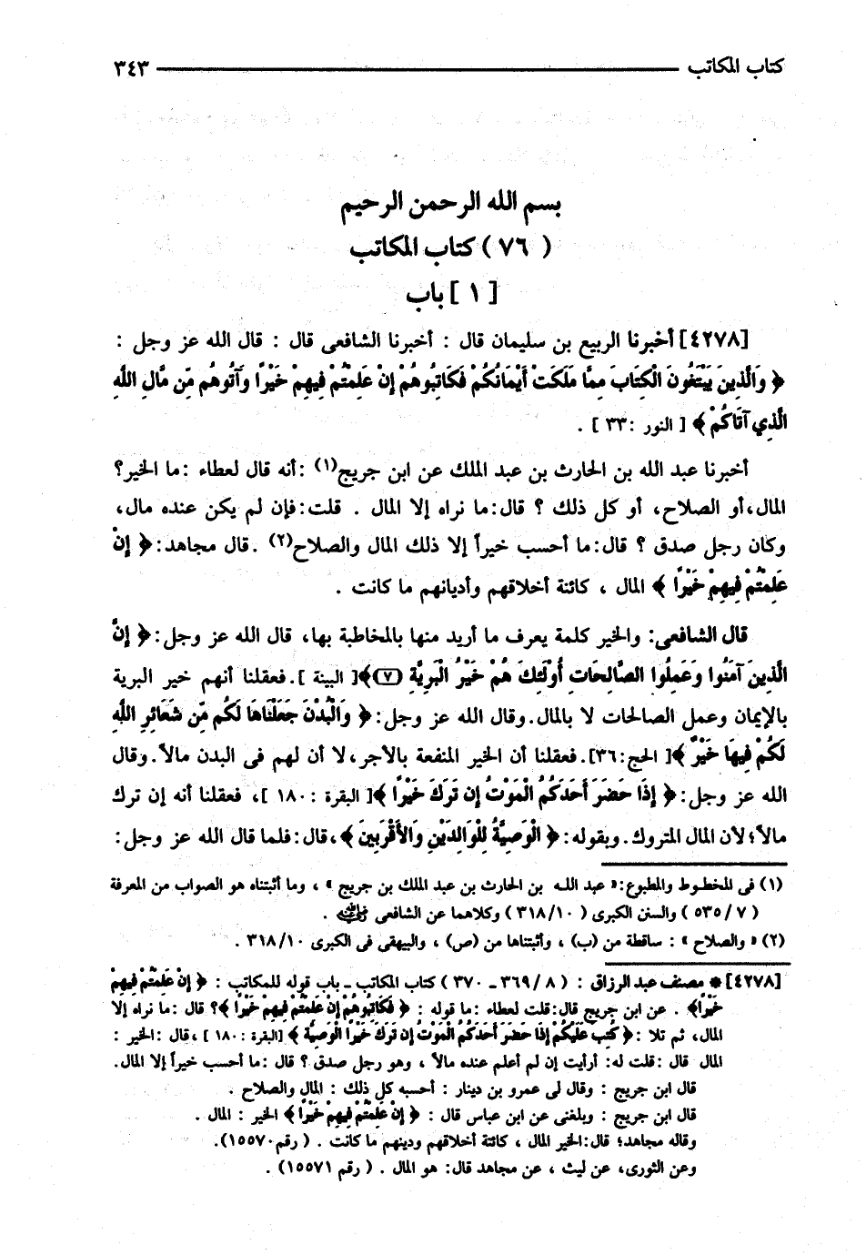 الْمُكَاتَبُ بسم الله الرحمن الرحيم أَخْبَرَنَا الرَّبِيعُ بْنُ سُلَيْمَانَ قَالَ : أَخْبَرَنَا الشَّافِعِيُّ رضي الله تعالى عنه قَالَ : قَالَ اللَّهُ عَزَّ وَجَلَّ : ? : وَاَلَّذِينَ يَبْتَغُونَ الْكِتَابَ مِمَّا مَلَكَتْ أَيْمَانُكُمْ فَكَاتِبُوهُمْ إنْ عَلِمْتُمْ فِيهِمْ خَيْرًا وَآتُوهُمْ مِنْ مَالِ اللَّهِ الَّذِي آتَاكُمْ ? أَخْبَرَنَا عَبْدُ اللَّهِ بْنُ الْحَارِثِ بْنِ عَبْدِ الْمَلِكِ بْنِ جُرَيْجٍ أَنَّهُ قَالَ لِعَطَاءٍ : مَا الْخَيْرُ ؟ الْمَالُ , أَوْ الصَّلاَحُ , أَوْ كُلُّ ذَلِكَ ؟ قَالَ : مَا نَرَاهُ إلَّا الْمَالَ , قُلْت : فَإِنْ لَمْ يَكُنْ عِنْدَهُ مَالٌ وَكَانَ رَجُلَ صِدْقٍ ؟ قَالَ : مَا أَحْسَبُ خَيْرًا إلَّا . ذَلِكَ الْمَالَ قَالَ مُجَاهِدٌ : ? : إنْ عَلِمْتُمْ فِيهِمْ خَيْرًا ? الْمَالُ كَائِنَةٌ أَخْلاَقُهُمْ وَأَدْيَانُهُمْ مَا كَانَتْ