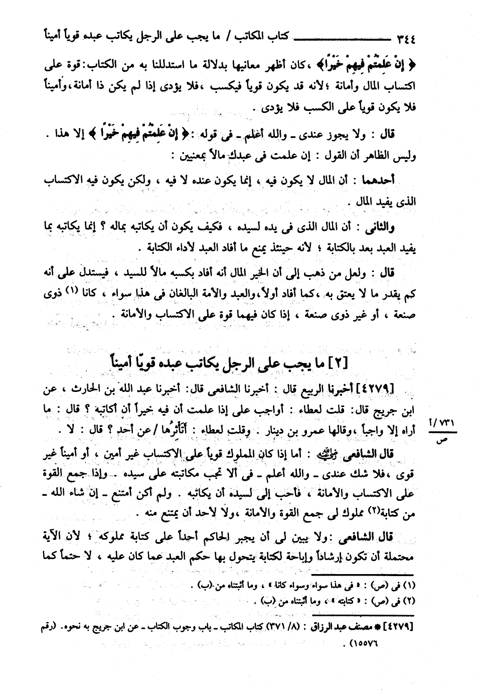 ? : إنْ عَلِمْتُمْ فِيهِمْ خَيْرًا ? كَانَ أَظْهَرُ مَعَانِيهَا بِدَلاَلَةِ مَا اسْتَدْلَلْنَا بِهِ مِنْ الْكِتَابِ قُوَّةً عَلَى اكْتِسَابِ الْمَالِ وَأَمَانَةً ; لِأَنَّهُ قَدْ يَكُونُ قَوِيًّا فَيَكْسِبُ فَلاَ يُؤَدِّي إذَا لَمْ يَكُنْ ذَا أَمَانَةٍ , وَأَمِينًا فَلاَ يَكُونُ قَوِيًّا عَلَى الْكَسْبِ فَلاَ يُؤَدِّي , قَالَ : وَلاَ يَجُوزُ عِنْدِي , وَاَللَّهُ تَعَالَى أَعْلَمُ , فِي قَوْلِهِ : ? : إنْ عَلِمْتُمْ فِيهِمْ خَيْرًا ? إلَّا هَذَا وَلَيْسَ الظَّاهِرُ أَنَّ الْقَوْلَ إنْ عَلِمْت فِي عَبْدِك مَالاً بِمَعْنَيَيْنِ أَحَدُهُمَا أَنَّ الْمَالَ لاَ يَكُونُ فِيهِ إنَّمَا يَكُونُ عِنْدَهُ لاَ فِيهِ , وَلَكِنْ يَكُونُ فِيهِ الِاكْتِسَابُ الَّذِي يُفِيدُ الْمَالَ , وَالثَّانِي أَنَّ الْمَالَ الَّذِي فِي يَدِهِ لِسَيِّدِهِ فَكَيْفَ يَكُونُ أَنْ يُكَاتِبَهُ بِمَالِهِ إنَّمَا يُكَاتِبُهُ بِمَا يُفِيدُ الْعَبْدُ بَعْدُ بِالْكِتَابَةِ ; لِأَنَّهُ حِينَئِذٍ يَمْنَعُ مَا أَفَادَ الْعَبْدَ لِأَدَاءِ الْكِتَابَةِ , قَالَ : وَلَعَلَّ مَنْ ذَهَبَ إلَى أَنَّ الْخَيْرَ الْمَالُ أَنَّهُ أَفَادَ بِكَسْبِهِ مَالاً لِلسَّيِّدِ , فَيُسْتَدَلُّ عَلَى أَنَّهُ كَمْ يَقْدِرُ مَالاً يَعْتِقُ بِهِ كَمَا أَفَادَ أَوَّلاً , وَالْعَبْدُ وَالْأَمَةُ الْبَالِغَانِ فِي هَذَا سَوَاءٌ , كَانَا ذَوِي صَنْعَةٍ أَوْ غَيْرَ ذَوِي صَنْعَةٍ , إذَا كَانَ فِيهِمَا قُوَّةٌ عَلَى الِاكْتِسَابِ وَالْأَمَانَةِ . مَا يَجِبُ عَلَى الرَّجُلِ يُكَاتِبُ عَبْدَهُ قَوِيًّا أَمِينًا ( أَخْبَرَنَا الرَّبِيعُ ) : قَالَ : أَخْبَرَنَا الشَّافِعِيُّ رضي الله تعالى عنه قَالَ : أَخْبَرَنَا عَبْدُ اللَّهِ بْنُ الْحَارِثِ عَنْ ابْنِ جُرَيْجٍ قَالَ : قُلْت لِعَطَاءٍ : أَوَاجِبٌ عَلَيَّ إذَا عَلِمْت أَنَّ فِيهِ خَيْرًا أَنْ أُكَاتِبَهُ ؟ قَالَ : مَا أَرَاهُ إلَّا وَاجِبًا وَقَالَهَا عَمْرُو بْنُ دِينَارٍ , وَقُلْت لِعَطَاءٍ : أَتَأْثُرُهَا عَنْ أَحَدٍ ؟ قَالَ : لاَ