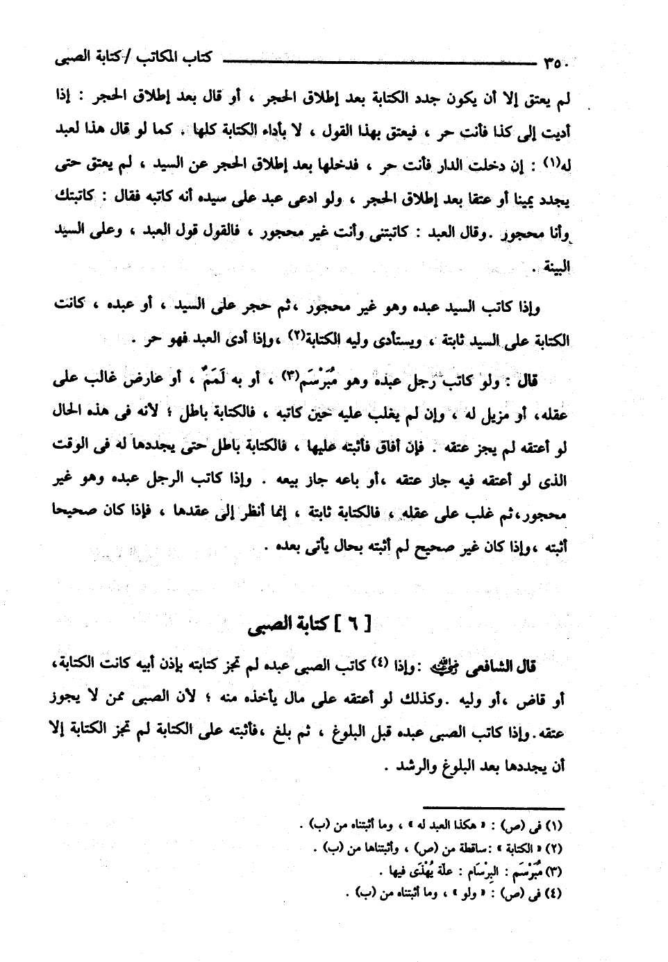 قَالَ الشَّافِعِيُّ : : رضي الله تعالى عنه وَإِذَا كَاتَبَ الصَّبِيُّ عَبْدَهُ لَمْ تَجُزْ كِتَابَتُهُ بِإِذْنِ أَبِيهِ كَانَتْ الْكِتَابَةُ , أَوْ قَاضٍ , أَوْ وَلِيِّهِ , وَكَذَلِكَ لَوْ أَعْتَقَهُ عَلَى مَالٍ يَأْخُذُهُ مِنْهُ ; لِأَنَّ الصَّبِيَّ مِمَّنْ لاَ يَجُوزُ عِتْقُهُ , وَإِذَا كَاتَبَ الصَّبِيُّ عَبْدَهُ قَبْلَ الْبُلُوغِ , ثُمَّ بَلَغَ فَأَثْبَتَهُ عَلَى الْكِتَابَةِ لَمْ تَجُزْ الْكِتَابَةُ إلَّا أَنْ يُجَدِّدَهَا بَعْدَ الْبُلُوغِ وَالرُّشْدِ .@