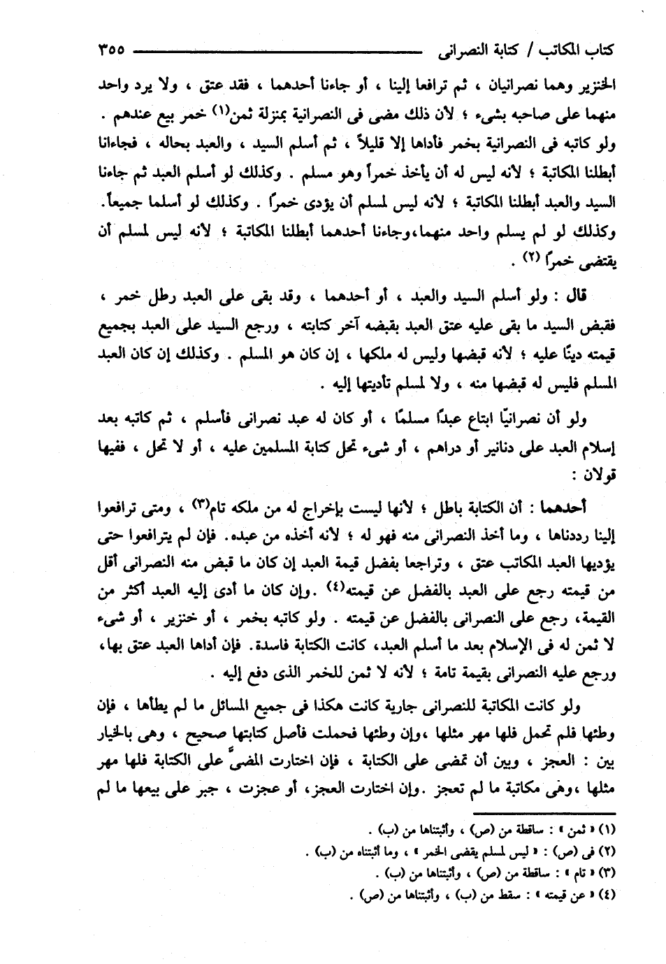 الْخِنْزِيرَ وَهُمَا نَصْرَانِيَّانِ , ثُمَّ تَرَافَعَا إلَيْنَا , أَوْ جَاءَنَا أَحَدُهُمَا فَقَدْ عَتَقَ وَلاَ يُزَادُ وَاحِدٌ مِنْهُمَا عَلَى صَاحِبِهِ بِشَيْءٍ ; لِأَنَّ ذَلِكَ مَضَى فِي النَّصْرَانِيَّةِ بِمَنْزِلَةِ ثَمَنِ خَمْرٍ بِيعَ عِنْدَهُمْ , وَلَوْ كَاتَبَهُ فِي النَّصْرَانِيَّةِ بِخَمْرٍ فَأَدَّاهَا إلَّا قَلِيلاً , ثُمَّ أَسْلَمَ السَّيِّدُ وَالْعَبْدُ بِحَالِهِ فَجَاءَانَا أَبْطَلْنَا الْمُكَاتَبَةَ كَأَنَّهُ لَيْسَ لَهُ أَنْ يَأْخُذَ خَمْرًا وَهُوَ مُسْلِمٌ , وَكَذَلِكَ لَوْ أَسْلَمَ الْعَبْدُ , ثُمَّ جَاءَنَا السَّيِّدُ وَالْعَبْدُ أَبْطَلْنَا الْمُكَاتَبَةَ , كَأَنَّهُ لَيْسَ لِمُسْلِمٍ أَنْ يُؤَدِّيَ خَمْرًا , وَكَذَلِكَ لَوْ أَسْلَمْنَا جَمِيعًا , وَكَذَلِكَ لَوْ لَمْ يُسْلَمْ وَاحِدٌ مِنْهُمَا وَجَاءَنَا أَحَدُهُمَا أَبْطَلْنَا الْمُكَاتَبَةَ ; لِأَنَّهُ لَيْسَ لِمُسْلِمٍ أَنْ يَقْتَضِيَ خَمْرًا ( قَالَ ) : وَلَوْ أَسْلَمَ السَّيِّدُ وَالْعَبْدُ , أَوْ أَحَدُهُمَا وَقَدْ بَقِيَ عَلَى الْعَبْدِ رِطْلُ خَمْرٍ فَقَبَضَ السَّيِّدُ مَا بَقِيَ عَلَيْهِ عَتَقَ الْعَبْدُ بِقَبْضِهِ آخِرَ كِتَابَتِهِ وَرَجَعَ السَّيِّدُ عَلَى الْعَبْدِ بِجَمِيعِ قِيمَتِهِ دَيْنًا عَلَيْهِ ; لِأَنَّهُ قَبَضَهَا وَلَيْسَ لَهُ مِلْكُهَا إنْ كَانَ هُوَ الْمُسْلِمُ , وَكَذَلِكَ إنْ كَانَ الْعَبْدُ الْمُسْلِمَ فَلَيْسَ لَهُ قَبْضُهَا مِنْهُ وَلاَ لِمُسْلِمٍ تَأْدِيَتُهَا إلَيْهِ . وَلَوْ أَنَّ نَصْرَانِيًّا ابْتَاعَ عَبْدًا مُسْلِمًا , أَوْ كَانَ لَهُ عَبْدٌ نَصْرَانِيٌّ فَأَسْلَمَ , ثُمَّ كَاتَبَهُ بَعْدَ إسْلاَمِ الْعَبْدِ عَلَى دَنَانِيرَ أَوْ دَرَاهِمَ , أَوْ شَيْءٍ تَحِلُّ كِتَابَةُ الْمُسْلِمِينَ عَلَيْهِ أَوْ لاَ تَحِلُّ فَفِيهَا قَوْلاَنِ . أَحَدُهُمَا : أَنَّ الْكِتَابَةَ بَاطِلٌ ; لِأَنَّهَا لَيْسَتْ بِإِخْرَاجٍ لَهُ مِنْ مِلْكِهِ تَامٍّ , وَمَتَى تَرَافَعُوا إلَيْنَا رَدَدْنَاهَا وَمَا أَخَذَ النَّصْرَانِيُّ مِنْهُ فَهُوَ لَهُ ; لِأَنَّهُ أَخَذَهُ مِنْ عَبْدِهِ فَإِنْ لَمْ يَتَرَافَعُوا حَتَّى يُؤَدِّيَهَا الْعَبْدُ الْمُكَاتَبُ عَتَقَ وَتَرَاجَعَا بِفَضْلِ قِيمَةِ الْعَبْدِ إنْ كَانَ مَا قَبَضَ مِنْهُ النَّصْرَانِيُّ أَقَلَّ مِنْ قِيمَتِهِ رَجَعَ عَلَى الْعَبْدِ بِالْفَضْلِ وَإِنْ كَانَ مَا أَدَّى إلَيْهِ الْعَبْدُ أَكْثَرَ مِنْ الْقِيمَةِ رَجَعَ عَلَى النَّصْرَانِيِّ بِالْفَضْلِ عَنْ قِيمَتِهِ وَلَوْ كَاتَبَهُ بِخَمْرٍ , أَوْ خِنْزِيرٍ أَوْ شَيْءٍ لاَ ثَمَنَ لَهُ فِي الْإِسْلاَمِ بَعْدَمَا أَسْلَمَ الْعَبْدُ كَانَتْ الْكِتَابَةُ فَاسِدَةً فَإِنْ أَدَّاهَا الْعَبْدُ عَتَقَ بِهَا وَرَجَعَ عَلَيْهِ النَّصْرَانِيُّ بِقِيمَةٍ تَامَّةٍ لِأَنَّهُ لاَ ثَمَنَ لِلْخَمْرِ الَّذِي دَفَعَ إلَيْهِ , وَلَوْ كَانَتْ الْمُكَاتَبَةُ لِلنَّصْرَانِيِّ جَارِيَةً كَانَتْ هَكَذَا فِي جَمِيعِ الْمَسَائِلِ مَا لَمْ يَطَأْهَا فَإِنْ وَطِئَهَا فَلَمْ تَحْمِلْ فَلَهَا مَهْرُ مِثْلِهَا وَإِنْ وَطِئَهَا فَحَمَلَتْ فَأَصْلُ كِتَابَتِهَا صَحِيحٌ وَهِيَ بِالْخِيَارِ بَيْنَ الْعَجْزِ وَبَيْنَ أَنْ تَمْضِيَ عَلَى الْكِتَابَةِ , فَإِنْ اخْتَارَتْ الْمُضِيَّ عَلَى الْكِتَابَةِ فَلَهَا مَهْرُ مِثْلِهَا وَهِيَ مُكَاتَبَةٌ مَا لَمْ تَعْجَزْ , وَإِنْ اخْتَارَتْ الْعَجْزَ أَوْ عَجَزَتْ جُبِرَ عَلَى بَيْعِهَا مَا لَمْ@