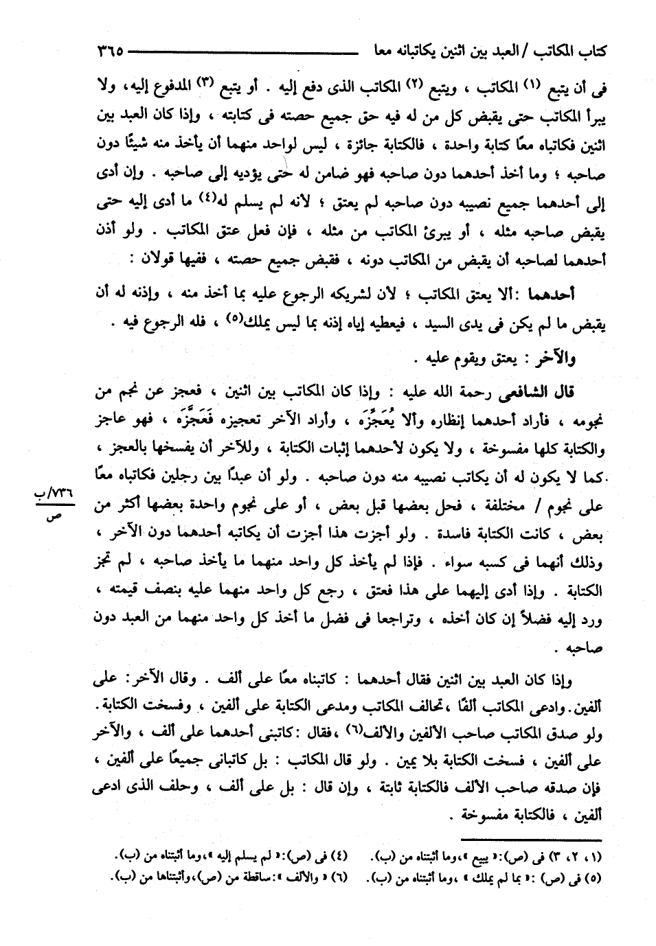 فِي أَنْ يَتْبَعَ الْمَكَاتِبَ وَيَتْبَعَ الْمُكَاتَبَ الَّذِي دَفَعَ إلَيْهِ , أَوْ يَتْبَعَ الْمَدْفُوعَ إلَيْهِ وَلاَ يَبْرَأُ الْمُكَاتَبُ حَتَّى يَقْبِضَ كُلُّ مَنْ لَهُ فِيهِ حَقٌّ جَمِيعَ حِصَّتِهِ فِي كِتَابَتِهِ . وَإِذَا كَانَ الْعَبْدُ بَيْنَ اثْنَيْنِ فَكَاتَبَاهُ مَعًا كِتَابَةً وَاحِدَةً فَالْكِتَابَةُ جَائِزَةٌ لَيْسَ لِوَاحِدٍ مِنْهُمَا أَنْ يَأْخُذَ مِنْهُ شَيْئًا دُونَ صَاحِبِهِ وَمَا أَخَذَ أَحَدُهُمَا دُونَ صَاحِبِهِ فَهُوَ ضَامِنٌ لَهُ حَتَّى يُؤَدِّيَهُ إلَى صَاحِبِهِ , وَإِنْ أَدَّى إلَى أَحَدِهِمَا جَمِيعَ نَصِيبِهِ دُونَ صَاحِبِهِ لَمْ يَعْتِقْ ; لِأَنَّهُ لَمْ يُسَلِّمْ لَهُ مَا أَدَّى إلَيْهِ حَتَّى يَقْبِضَ صَاحِبَهُ مِثْلَهُ , أَوْ يُبْرِئَ الْمَكَاتِبُ مِنْ مِثْلِهِ , فَإِنْ فَعَلَ عَتَقَ الْمُكَاتَبُ وَلَوْ أَذِنَ أَحَدُهُمَا لِصَاحِبِهِ أَنْ يَقْبِضَ مِنْ الْمُكَاتَبِ دُونَهُ فَقَبَضَ جَمِيعَ حِصَّتِهِ فَفِيهَا قَوْلاَنِ . أَحَدُهُمَا : أَنْ لاَ يَعْتِقَ الْمُكَاتَبُ ; لِأَنَّ لِشَرِيكِهِ الرُّجُوعَ عَلَيْهِ بِمَا أَخَذَ مِنْهُ , وَإِذْنُهُ لَهُ أَنْ يَقْبِضَ مَا لَمْ يَكُنْ فِي يَدَيْ السَّيِّدِ فَيُعْطِيه إيَّاهُ إذْنَهُ بِمَا . لَيْسَ يَمْلِكُ فَلَهُ الرُّجُوعُ فِيهِ . وَالْآخَرُ : يَعْتِقُ وَيُقَوَّمُ عَلَيْهِ