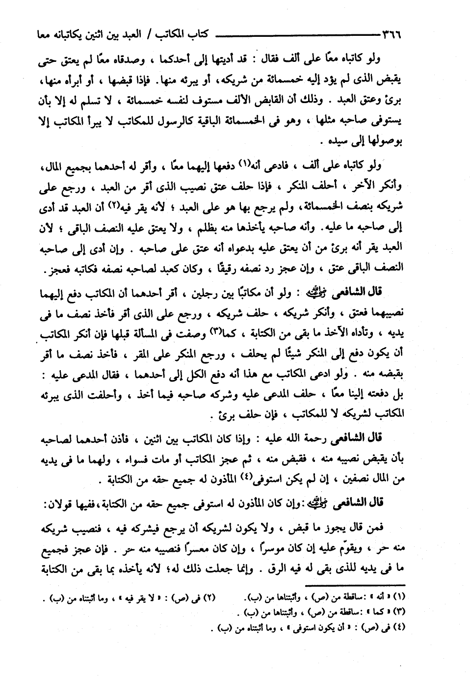 قَالَ الشَّافِعِيُّ : : رحمه الله تعالى وَلَوْ أَنَّ مُكَاتَبًا بَيْنَ رَجُلَيْنِ أَقَرَّ أَحَدُهُمَا أَنَّ الْمُكَاتَبَ دَفَعَ إلَيْهِمَا نُصِيبَهُمَا فَعَتَقَ وَأَنْكَرَ شَرِيكُهُ حَلَفَ شَرِيكُهُ وَرَجَعَ عَلَى الَّذِي أَقَرَّ فَأَخَذَ نِصْفَ مَا فِي يَدَيْهِ وتأداه الْآخِذُ مَا بَقِيَ مِنْ الْكِتَابَةِ كَمَا وَصَفْت فِي الْمَسْأَلَةِ قَبْلَهَا فَإِنْ أَنْكَرَ الْمُكَاتَبُ أَنْ يَكُونَ دَفَعَ إلَى الْمُنْكِرِ شَيْئًا لَمْ يَحْلِفْ وَرَجَعَ الْمُنْكِرُ عَلَى الْمُقِرِّ فَأَخَذَ نِصْفَ مَا أَقَرَّ بِقَبْضِهِ مِنْهُ , وَلَوْ ادَّعَى الْمُكَاتَبُ مَعَ هَذَا أَنَّهُ دَفَعَ الْكُلَّ إلَى أَحَدِهِمَا فَقَالَ الْمُدَّعَى عَلَيْهِ : بَلْ دَفَعْته إلَيْنَا مَعًا حَلَفَ الْمُدَّعَى عَلَيْهِ وَشَرَكَهُ صَاحِبُهُ فِيمَا أَخَذَ وَأَحْلَفْت الَّذِي يُبَرِّئُهُ الْمَكَاتِبُ لِشَرِيكِهِ لاَ لِلْمُكَاتَبِ فَإِنْ حَلَفَ بَرِئَ