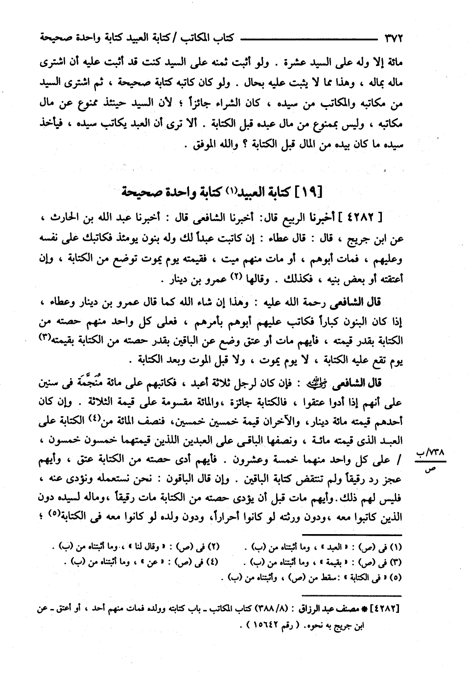 , كِتَابَةُ الْعَبِيدِ كِتَابَةٌ وَاحِدَةٌ صَحِيحَةٌ ( أَخْبَرَنَا الرَّبِيعُ ) : قَالَ : أَخْبَرَنَا الشَّافِعِيُّ رحمه الله تعالى قَالَ : أَخْبَرَنَا عَبْدُ اللَّهِ بْنُ الْحَارِثِ عَنْ ابْنِ جُرَيْجٍ قَالَ : قَالَ عَطَاءٌ : إنْ كَاتَبْت عَبْدًا لَك وَلَهُ بَنُونَ يَوْمئِذٍ فَكَاتَبَك عَلَى نَفْسِهِ وَعَلَيْهِمْ فَمَاتَ أَبُوهُمْ , أَوْ مَاتَ مِنْهُمْ مَيِّتٌ , فَقِيمَتُهُ يَوْمَ يَمُوتُ تُوضَعُ مِنْ الْكِتَابَةِ وَإِنْ أَعْتَقْته , أَوْ بَعْضَ بَنِيهِ فَكَذَلِكَ , وَقَالَهَا عَمْرُو بْنُ دِينَارٍ