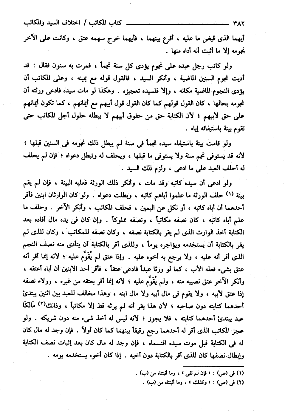 وَلَوْ ادَّعَى أَنَّ سَيِّدَهُ كَاتَبَهُ وَقَدْ مَاتَ وَأَنْكَرَ ذَلِكَ الْوَرَثَةُ فَعَلَيْهِ الْبَيِّنَةُ فَإِنْ لَمْ يُقِمْ بَيِّنَةً حَلَفَ الْوَرَثَةُ مَا عَلِمُوا أَبَاهُمْ كَاتَبَهُ وَبَطَلَتْ دَعْوَاهُ , وَلَوْ كَانَ الْوَارِثَانِ ابْنَيْنِ فَأَقَرَّ أَحَدُهُمَا أَنَّ أَبَاهُ كَاتَبَهُ , أَوْ نَكَلَ عَنْ الْيَمِينِ فَحَلَفَ الْمُكَاتَبُ وَأَنْكَرَ الْآخَرُ , وَحَلَفَ مَا عَلِمَ أَبَاهُ كَاتَبَهُ كَانَ نِصْفُهُ مُكَاتَبًا وَنِصْفُهُ مَمْلُوكًا , وَإِنْ كَانَ فِي يَدِهِ مَالٌ أَفَادَهُ بَعْدَ الْكِتَابَةِ أَخَذَ الْوَارِثُ الَّذِي لَمْ يُقِرَّ بِالْكِتَابَةِ نِصْفَهُ , وَكَانَ نِصْفُهُ لِلْمُكَاتَبِ وَكَانَ لِلَّذِي لَمْ يُقِرَّ بِالْكِتَابَةِ أَنْ يَسْتَخْدِمَهُ وَيُؤَاجِرَهُ يَوْمًا , وَلِلَّذِي أَقَرَّ بِالْكِتَابَةِ أَنْ يَتَأَدَّى مِنْهُ نِصْفَ النَّجْمِ الَّذِي أَقَرَّ أَنَّهُ عَلَيْهِ وَلاَ يَرْجِعُ بِهِ أَخُوهُ عَلَيْهِ وَإِذَا عَتَقَ لَمْ يُقَوَّمْ عَلَيْهِ ; لِأَنَّهُ إنَّمَا أَقَرَّ أَنَّهُ عَتَقَ بِشَيْءٍ فَعَلَهُ الْأَبُ كَمَا لَوْ وَرِثَا عَبْدًا فَادَّعَى عِتْقًا فَأَقَرَّ أَحَدُ الِابْنَيْنِ أَنَّ أَبَاهُ أَعْتَقَهُ وَأَنْكَرَ الْآخَرُ عَتَقَ نَصِيبُهُ مِنْهُ , وَلَمْ يُقَوَّمْ عَلَيْهِ ; لِأَنَّهُ إنَّمَا أَقَرَّ بِعِتْقِهِ مِنْ غَيْرِهِ , وَوَلاَءُ نِصْفِهِ إذَا عَتَقَ لِأَبِيهِ , وَلاَ يُقَوَّمُ فِي مَالِ أَبِيهِ وَلاَ مَالِ ابْنِهِ وَهَذَا مُخَالِفٌ لِلْعَبْدِ بَيْنَ اثْنَيْنِ يَبْتَدِئُ أَحَدُهُمَا كِتَابَتَهُ دُونَ صَاحِبِهِ ; لِأَنَّ هَذَا يُقِرُّ أَنَّهُ لَمْ يَرِثْهُ قَطُّ إلَّا مُكَاتَبًا وَذَانِكَ مَالِكَا عَبْدٍ يَبْتَدِئُ أَحَدُهُمَا كِتَابَتَهُ فَلاَ يَجُوزُ لِأَنَّهُ لَيْسَ لَهُ أَخْذُ شَيْءٍ مِنْهُ دُونَ شَرِيكِهِ وَلَوْ عَجَزَ الْمُكَاتَبُ الَّذِي أَقَرَّ لَهُ أَحَدُهُمَا رَجَعَ رَقِيقًا بَيْنَهُمَا كَمَا كَانَ أَوَّلاً فَإِنْ وُجِدَ لَهُ مَالٌ كَانَ لَهُ فِي الْكِتَابَةِ قَبْلَ مَوْتِ سَيِّدِهِ اقْتَسَمَاهُ فَإِنْ وُجِدَ لَهُ مَالٌ كَانَ بَعْدَ إثْبَاتِ نِصْفِ الْكِتَابَةِ وَإِبْطَالِ نِصْفِهَا كَانَ لِلَّذِي أَقَرَّ بِالْكِتَابَةِ دُونَ أَخِيهِ إذَا كَانَ أَخُوهُ يَسْتَخْدِمُهُ يَوْمَهُ@