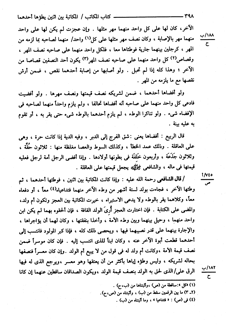 قَالَ الشَّافِعِيُّ : : رحمه الله تعالى وَإِذَا كَانَتْ الْمُكَاتَبَةُ بَيْنَ اثْنَيْنِ فَوَطِئَهَا أَحَدُهُمَا ثُمَّ وَطِئَهَا الْآخَرُ فَجَاءَتْ بِوَلَدٍ لِسِتَّةِ أَشْهُرٍ مِنْ وَطْءِ الْآخَرِ مِنْهُمَا فَتَدَاعَيَاهُ مَعًا أَوْ دَفَعَاهُ مَعًا , وَكِلاَهُمَا يُقِرُّ بِالْوَطْءِ , وَلاَ يَدَّعِي الِاسْتِبْرَاءَ خُيِّرَتْ الْمُكَاتَبَةُ بَيْنَ الْعَجْزِ وَتَكُونُ أُمَّ وَلَدٍ وَالْمُضِيِّ عَلَى الْكِتَابَةِ , فَإِنْ اخْتَارَتْ الْعَجْزَ أُرِيَ الْوَلَدَ الْقَافَةُ , فَإِنْ أَلْحَقُوهُ بِهِمَا لَمْ يَكُنْ ابْنَ وَاحِدٍ مِنْهُمَا وَحِيلَ بَيْنَهُمَا وَبَيْنَ وَطْءِ الْأَمَةِ , وَأَخَذَا بِنَفَقَتِهَا , وَكَانَ لَهُمَا أَنْ يُؤَجِّرَاهَا , وَالْإِجَارَةُ بَيْنَهُمَا عَلَى قَدْرِ نَصِيبِهِمَا فِيهَا , وَيُحْصَى ذَلِكَ كُلُّهُ فَإِذَا كَبِرَ الْمَوْلُودُ فَانْتَسَبَ إلَى أَحَدِهِمَا قُطِعَتْ أُبُوَّةُ الْآخَرِ عَنْهُ , وَكَانَ ابْنًا لِلَّذِي انْتَسَبَ إلَيْهِ فَإِنْ كَانَ مُوسِرًا ضَمِنَ نِصْفَ قِيمَةِ الْأَمَةِ وَكَانَتْ أُمَّ وَلَدٍ لَهُ فِي قَوْلِ مَنْ لاَ يَبِيعُ أُمَّ الْوَلَدِ وَإِنْ كَانَ مُعْسِرًا فَنِصْفُهَا بِحَالِهِ لِشَرِيكِهِ وَلَيْسَ وَطْؤُهُ إيَّاهَا بِأَكْثَرَ مِنْ أَنْ يُعْتِقَهَا , وَهُوَ مُعْسِرٌ , وَيَرْجِعُ الَّذِي لَهُ فِيهَا الرِّقُّ عَلَى الَّذِي لَحِقَ بِهِ الْوَلَدُ بِنِصْفِ قِيمَةِ الْوَلَدِ , وَيَكُونُ الصَّدَاقَانِ سَاقِطَيْنِ عَنْهُمَا إنْ كَانَا@