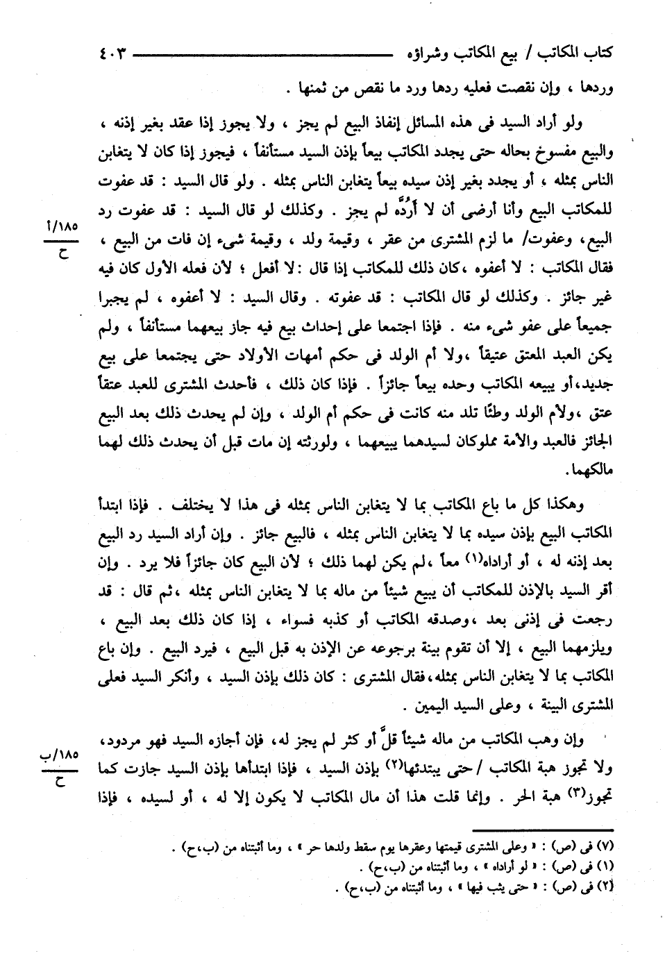 وَرَدُّهَا , وَإِنْ نَقَصَتْ فَعَلَيْهِ رَدُّهَا وَرَدُّ مَا نَقَصَ مِنْ ثَمَنِهَا , وَلَوْ أَرَادَ السَّيِّدُ فِي هَذِهِ الْمَسَائِلِ إنْفَاذَ الْبَيْعِ لَمْ يَجُزْ وَلاَ يَجُوزُ إذَا عَقَدَ بِغَيْرِ إذْنِهِ , وَالْبَيْعُ مَفْسُوخٌ بِحَالِهِ حَتَّى يُحَدِّدَ الْمُكَاتَبُ بَيْعًا بِإِذْنِ السَّيِّدِ مُسْتَأْنَفًا فَيَجُوزُ إذَا كَانَ لاَ يَتَغَابَنُ النَّاسُ بِمِثْلِهِ أَوْ يُجَدِّدَ بِغَيْرِ إذْنِ سَيِّدِهِ بَيْعًا يَتَغَابَنُ النَّاسُ بِمِثْلِهِ , وَلَوْ قَالَ السَّيِّدُ قَدْ عَفَوْت لِلْمُكَاتَبِ الْبَيْعَ , وَأَنَا أَرْضَى أَنْ لاَ أَرُدَّهُ لَمْ يَجُزْ . وَكَذَلِكَ لَوْ قَالَ السَّيِّدُ : قَدْ عَفَوْت رُدَّ الْبَيْعُ وَعَفَوْت مَا لَزِمَ الْمُشْتَرِيَ مِنْ عُقْرٍ وَقِيمَةِ وَلَدٍ وَقِيمَةِ شَيْءٍ إنْ فَاتَ مِنْ الْبَيْعِ فَقَالَ الْمُكَاتَبُ : لاَ أَعْفُوهُ كَانَ ذَلِكَ لِلْمُكَاتَبِ إذَا قَالَ : لاَ أَفْعَلُ ; لِأَنَّ فِعْلَهُ الْأَوَّلَ كَانَ فِيهِ غَيْرَ جَائِزٍ , وَكَذَلِكَ لَوْ قَالَ الْمُكَاتَبُ : قَدْ عَفَوْته وَقَالَ السَّيِّدُ : لاَ أَعْفُوهُ لَمْ يُجْبَرَا جَمِيعًا عَلَى عَفْوِ شَيْءٍ مِنْهُ فَإِذَا اجْتَمَعَا عَلَى إحْدَاثِ بَيْعٍ فِيهِ جَازَ بَيْعُهُمَا مُسْتَأْنَفًا , وَلَمْ يَكُنْ الْعَبْدُ الْمُعْتَقُ عَتِيقًا , وَلاَ أُمُّ الْوَلَدِ فِي حُكْمِ أُمَّهَاتِ الْأَوْلاَدِ حَتَّى يَجْتَمِعَا عَلَى بَيْعٍ جَدِيدٍ أَوْ يَبِيعَهُ الْمُكَاتَبُ وَحْدَهُ بَيْعًا جَائِزًا , فَإِذَا كَانَ ذَلِكَ فَأَحْدَثَ الْمُشْتَرِي لِلْعَبْدِ عِتْقًا عَتَقَ وَلِأُمِّ الْوَلَدِ وَطْئًا تَلِدُ مِنْهُ كَانَتْ فِي حُكْمِ أُمِّ الْوَلَدِ وَإِنْ لَمْ يُحْدِثْ ذَلِكَ بَعْدَ الْبَيْعِ الْجَائِزِ فَالْعَبْدُ وَالْأَمَةُ مَمْلُوكَانِ لِسَيِّدِهِمَا يَبِيعُهُمَا وَلِوَرَثَتِهِ إنْ مَاتَ قَبْلَ أَنْ يُحْدِثَ ذَلِكَ لَهُمَا مَالِكُهُمَا , وَهَكَذَا كُلُّ مَا بَاعَ الْمُكَاتَبُ بِمَا لاَ يَتَغَابَنُ النَّاسُ بِمِثْلِهِ فِي هَذَا لاَ يَخْتَلِفُ فَإِذَا ابْتَدَأَ الْمُكَاتَبُ الْبَيْعَ بِإِذْنِ سَيِّدِهِ بِمَا لاَ يَتَغَابَنُ النَّاسُ بِمِثْلِهِ فَالْبَيْعُ جَائِزٌ وَإِنْ أَرَادَ السَّيِّدُ رَدَّ الْبَيْعِ بَعْدَ إذْنِهِ لَهُ أَوْ أَرَادَاهُ مَعًا لَمْ يَكُنْ لَهُمَا ذَلِكَ ; لِأَنَّ الْبَيْعَ كَانَ جَائِزًا فَلاَ يُرَدُّ .