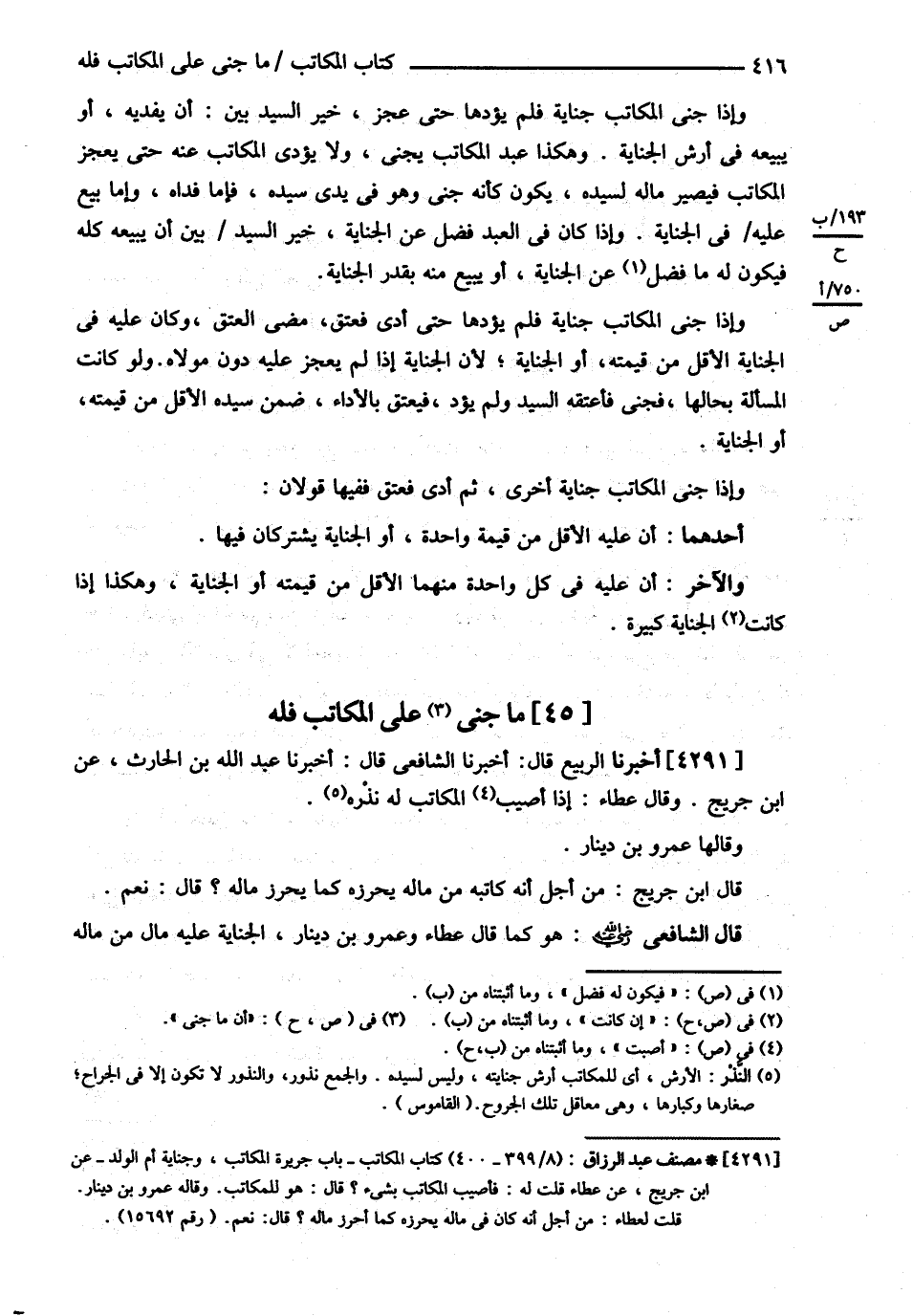 مَا جُنِيَ عَلَى الْمُكَاتَبِ فَلَهُ ( أَخْبَرَنَا الرَّبِيعُ ) قَالَ : أَخْبَرَنَا الشَّافِعِيُّ رحمه الله تعالى قَالَ : أَخْبَرَنَا عَبْدُ اللَّهِ بْنُ الْحَارِثِ عَنْ ابْنِ جُرَيْجٍ وَقَالَ عَطَاءٌ : إذَا أُصِيبَ الْمُكَاتَبُ لَهُ نَذْرُهُ وَقَالَهَا عَمْرُو بْنُ دِينَارٍ قَالَ ابْنُ جُرَيْجٍ مِنْ أَجْلِ أَنَّهُ كَاتَبَهُ مِنْ مَالِهِ يُحْرِزُهُ كَمَا يُحْرِزُ مَالَهُ ؟ قَالَ نَعَمْ