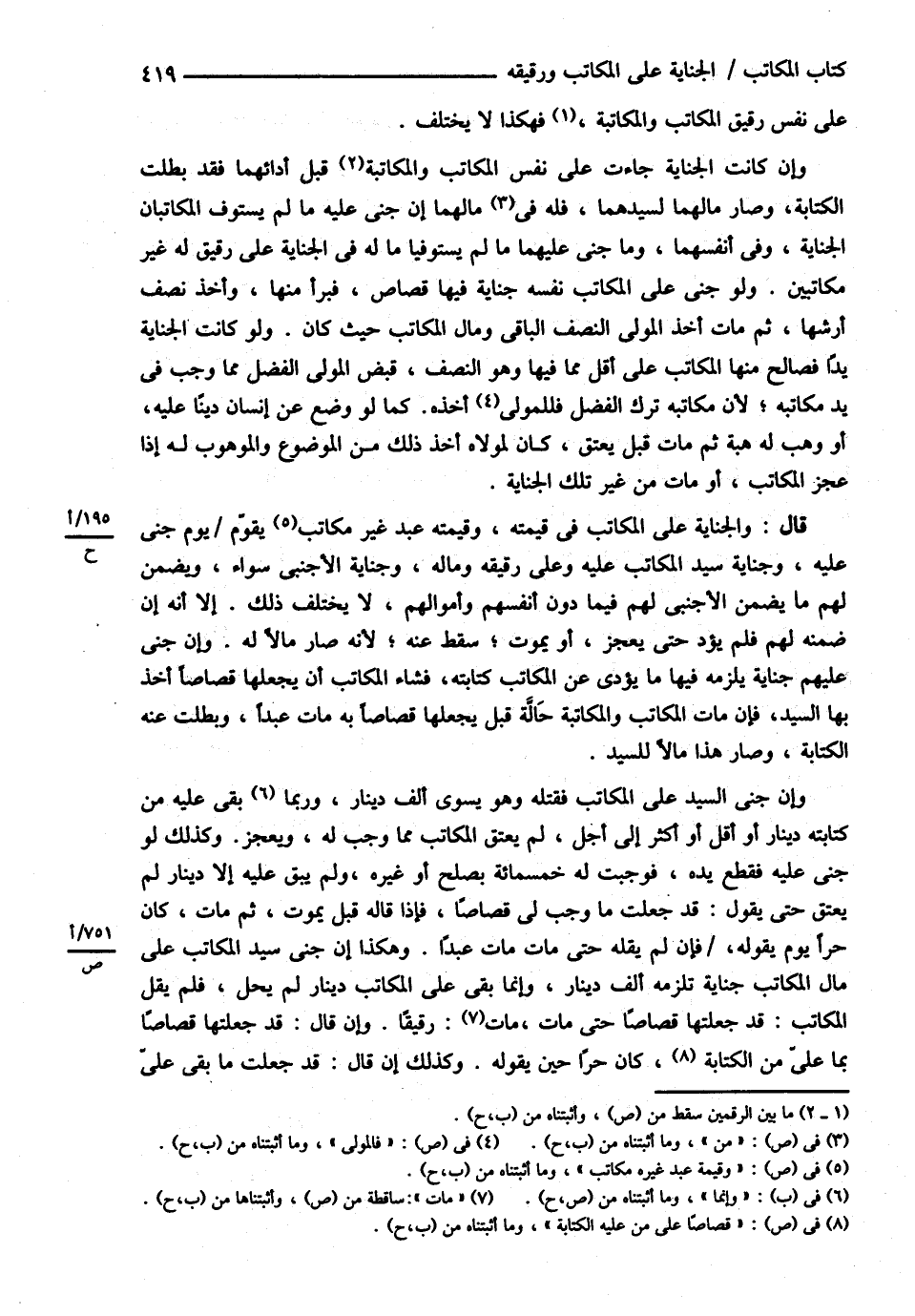 وَإِنْ جَنَى السَّيِّدُ عَلَى الْمُكَاتَبِ فَقَتَلَهُ وَهُوَ يَسْوَى أَلْفَ دِينَارٍ وَإِنَّمَا بَقِيَ عَلَيْهِ مِنْ كِتَابَتِهِ دِينَارٌ أَوْ أَقَلُّ أَوْ أَكْثَرُ إلَى أَجَلٍ لَمْ يَعْتِقْ الْمُكَاتَبُ مِمَّا وَجَبَ لَهُ وَيُعَجَّزُ وَكَذَلِكَ لَوْ جَنَى عَلَيْهِ فَقَطَعَ يَدَهُ فَوَجَبَتْ لَهُ خَمْسُمِائَةٍ بِصُلْحٍ أَوْ غَيْرِهِ وَلَمْ يَبْقَ عَلَيْهِ إلَّا دِينَارٌ لَمْ يَعْتِقْ حَتَّى يَقُولَ قَدْ جَعَلْت مَا وَجَبَ لِي قِصَاصًا فَإِذَا قَالَهُ قَبْلَ يَمُوتُ , ثُمَّ مَاتَ كَانَ حُرًّا حِينَ يَقُولُهُ , فَإِنْ لَمْ يَقُلْهُ حَتَّى مَاتَ كَانَ عَبْدًا وَهَكَذَا إنْ جَنَى سَيِّدُ الْمُكَاتَبِ عَلَى مَالِ الْمُكَاتَبِ جِنَايَةً تَلْزَمُهُ أَلْفُ دِينَارٍ وَإِنَّمَا بَقِيَ عَلَى الْمُكَاتَبِ دِينَارٌ لَمْ يَحِلَّ فَلَمْ يَقُلْ الْمُكَاتَبُ قَدْ : جَعَلْتهَا قِصَاصًا حَتَّى مَاتَ , مَاتَ رَقِيقًا , وَإِنْ قَالَ قَدْ جَعَلْتهَا قِصَاصًا بِمَا عَلَيَّ مِنْ الْكِتَابَةِ كَانَ حُرًّا حِينَ يَقُولُهُ وَكَذَلِكَ إنْ قَالَ : قَدْ جَعَلْت مَا بَقِيَ عَلَيَّ@