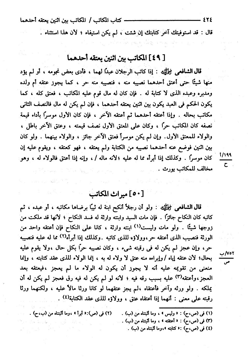قَالَ الشَّافِعِيُّ : : رحمه الله تعالى إذَا كَاتَبَ الرَّجُلاَنِ عَبْدًا لَهُمَا فَأَدَّى بَعْضَ نُجُومِهِ أَوْ لَمْ يُؤَدِّ مِنْهَا شَيْئًا حَتَّى أَعْتَقَ أَحَدُهُمَا نَصِيبَهُ مِنْهُ فَنَصِيبُهُ مِنْهُ حُرٌّ كَمَا يَجُوزُ عِتْقُهُ أُمَّ وَلَدِهِ وَمُدَبَّرِهِ وَعَبْدَهُ الَّذِي لاَ كِتَابَةَ لَهُ , فَإِنْ كَانَ لَهُ مَالٌ قُوِّمَ عَلَيْهِ الْمُكَاتَبُ فَعَتَقَ كُلُّهُ كَمَا يَكُونُ الْحُكْمُ فِي الْعَبْدِ يَكُونُ بَيْنَ اثْنَيْنِ يُعْتِقُهُ أَحَدُهُمَا , فَإِنْ لَمْ يَكُنْ لَهُ مَالٌ فَالنِّصْفُ الثَّانِي مُكَاتَبٌ بِحَالِهِ وَإِذَا أَعْتَقَهُ أَحَدُهُمَا , ثُمَّ أَعْتَقَهُ الْآخَرُ , فَإِنْ كَانَ الْأَوَّلُ مُوسِرًا بِأَدَاءِ قِيمَةِ نِصْفِهِ كَانَ الْمُكَاتَبُ حُرًّا وَكَانَ عَلَى الْمُعْتِقِ الْأَوَّلِ نِصْفُ قِيمَتِهِ وَعِتْقُ الْآخَرِ بَاطِلٌ وَالْوَلاَءُ لِلْمُعْتِقِ الْأَوَّلِ وَإِنْ لَمْ يَكُنْ مُوسِرًا فَعِتْقُ الْآخَرِ جَائِزٌ وَالْوَلاَءُ بَيْنَهُمَا .