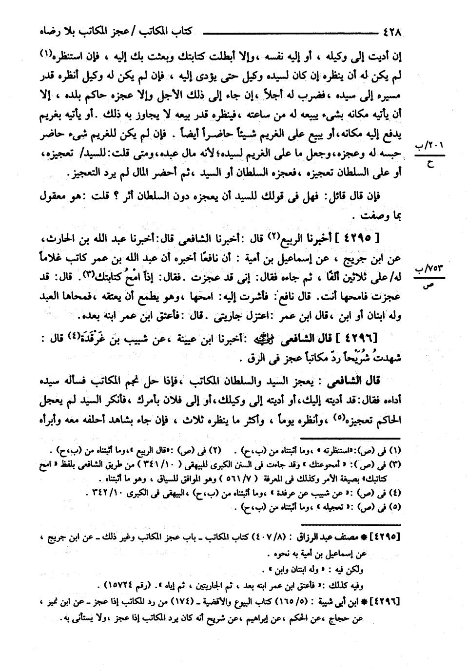 قَالَ الشَّافِعِيُّ : : رحمه الله أَخْبَرَنَا ابْنُ عُيَيْنَةَ عَنْ شَبِيبِ بْنِ غَرْقَدَةَ قَالَ : شَهِدْت شُرَيْحًا رَدَّ مُكَاتَبًا عَجَزَ فِي الرِّقِّ .