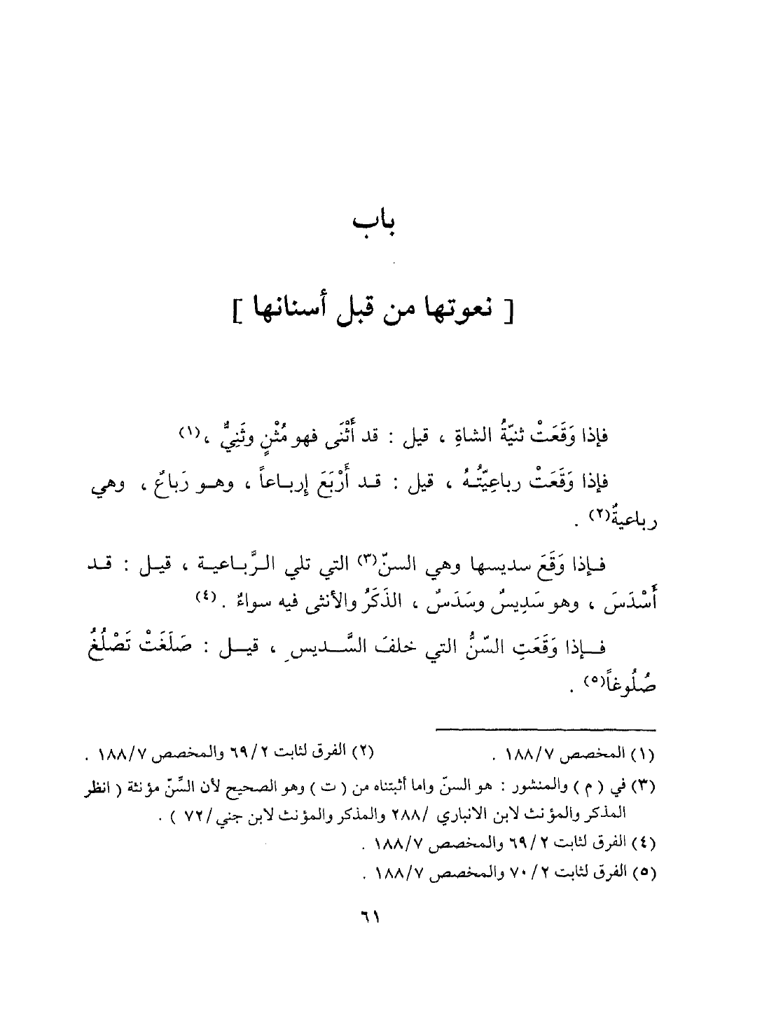 فإذا وقعت ثنية الشاة، قيل قد أثنى فهو مثن وثني، فإذا وقعت رباعيته، قيل قد أربع إرباعاً، وهو رباع، وهي رباعية.