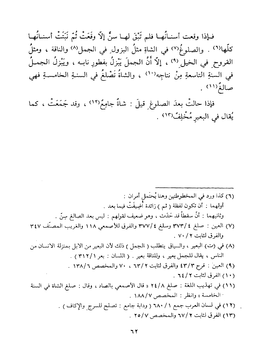 فإذا وقعت أسنانها فلم تبق لها سن إلا وقعت ثم نبتت أسنانها كلها. والصلوغ في الشاة مثل البزول في الجمل والناقة ومثل القروح في الخيل، إلا أن الجمل يبزل بفطور نابه، ويبزل الجمل في السنة التاسعة من نتاجه، والشاة تصلغ في السنة الخامسة فهي صالغ.