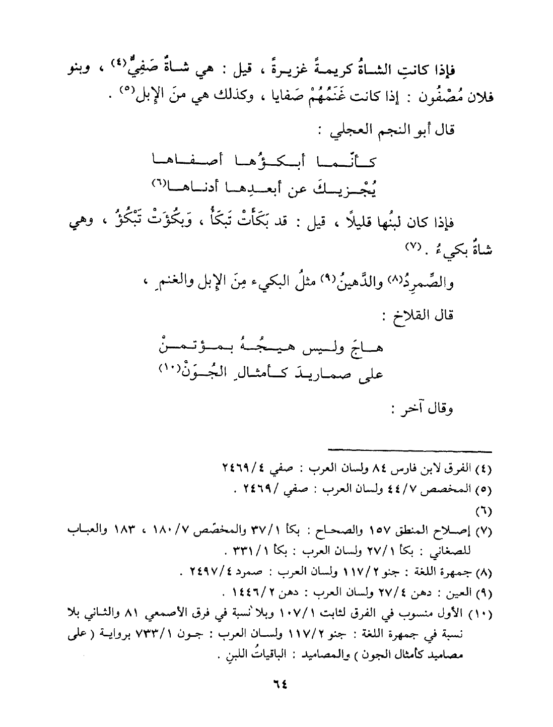 فإذا كانت الشاة كريمة غزيرة، قيل هي شاة صفي، وبنو فلان مصفون إذا كانت غنمهم صفايا، وكذلك هي من الإبل.