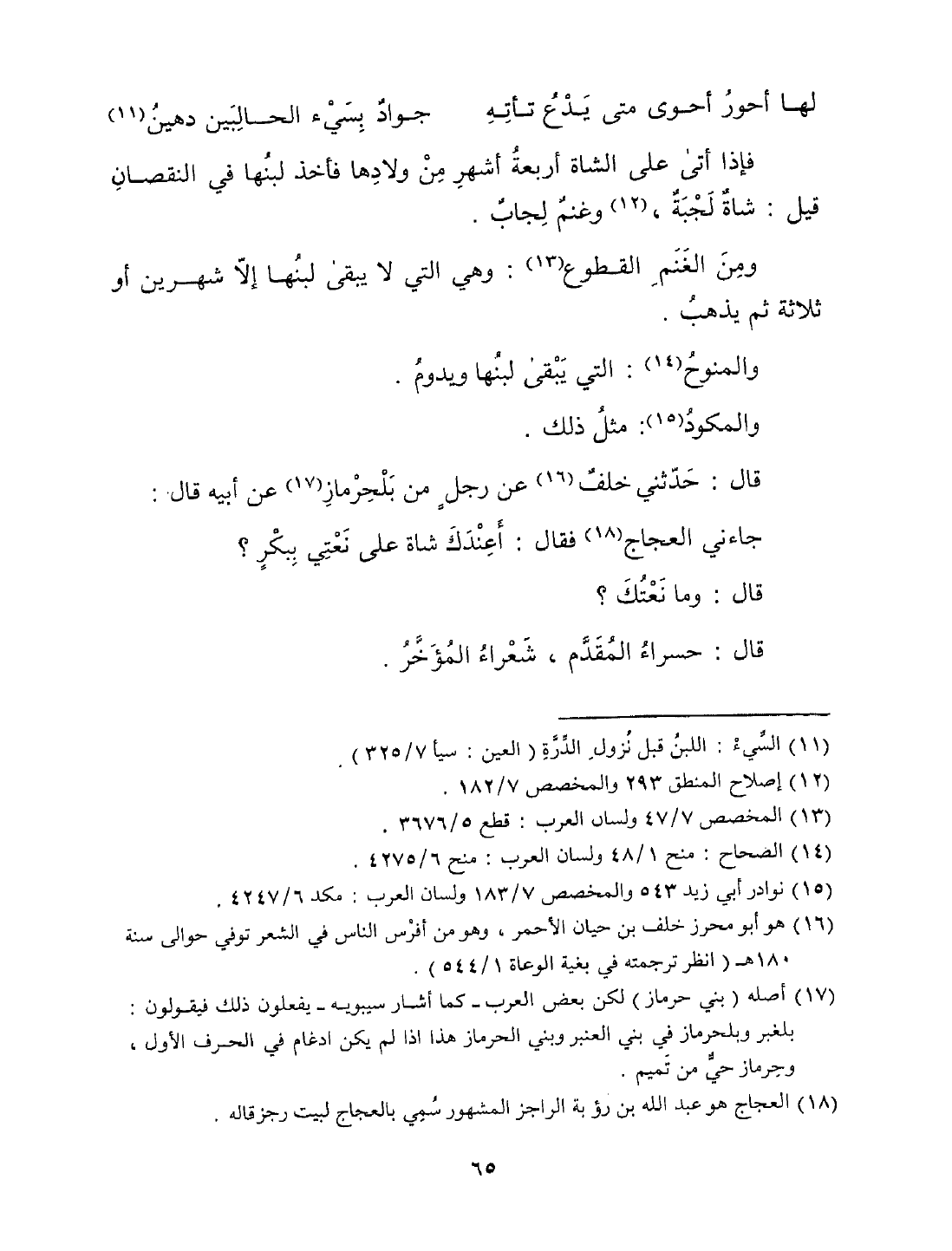 قال حدثني خلف عن رجل من بلحرماز عن أبيه قال جاءني العجاج فقال أعندك شاة على نعتي ببكر؟ قال وما نعتك؟ قال حسراء المقدم، شعراء المؤخر.