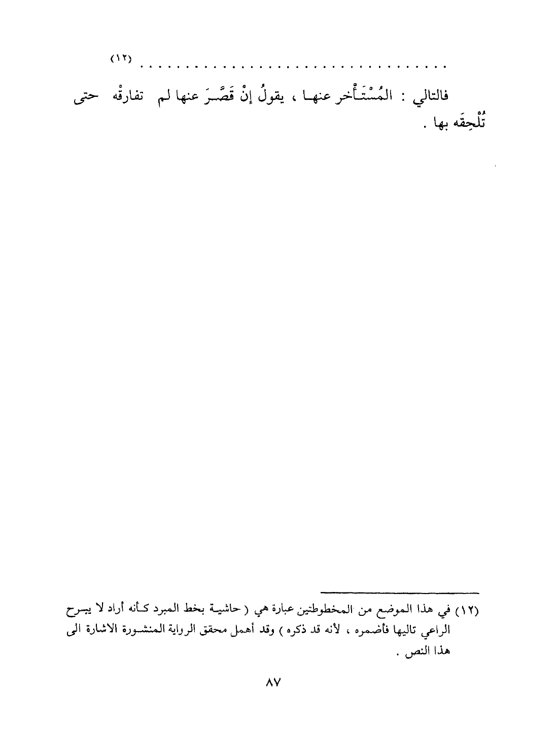 فالتالي المستأخر عنها، يقول إن قصر عنها لم تفارقه حتى تلحقه بها.