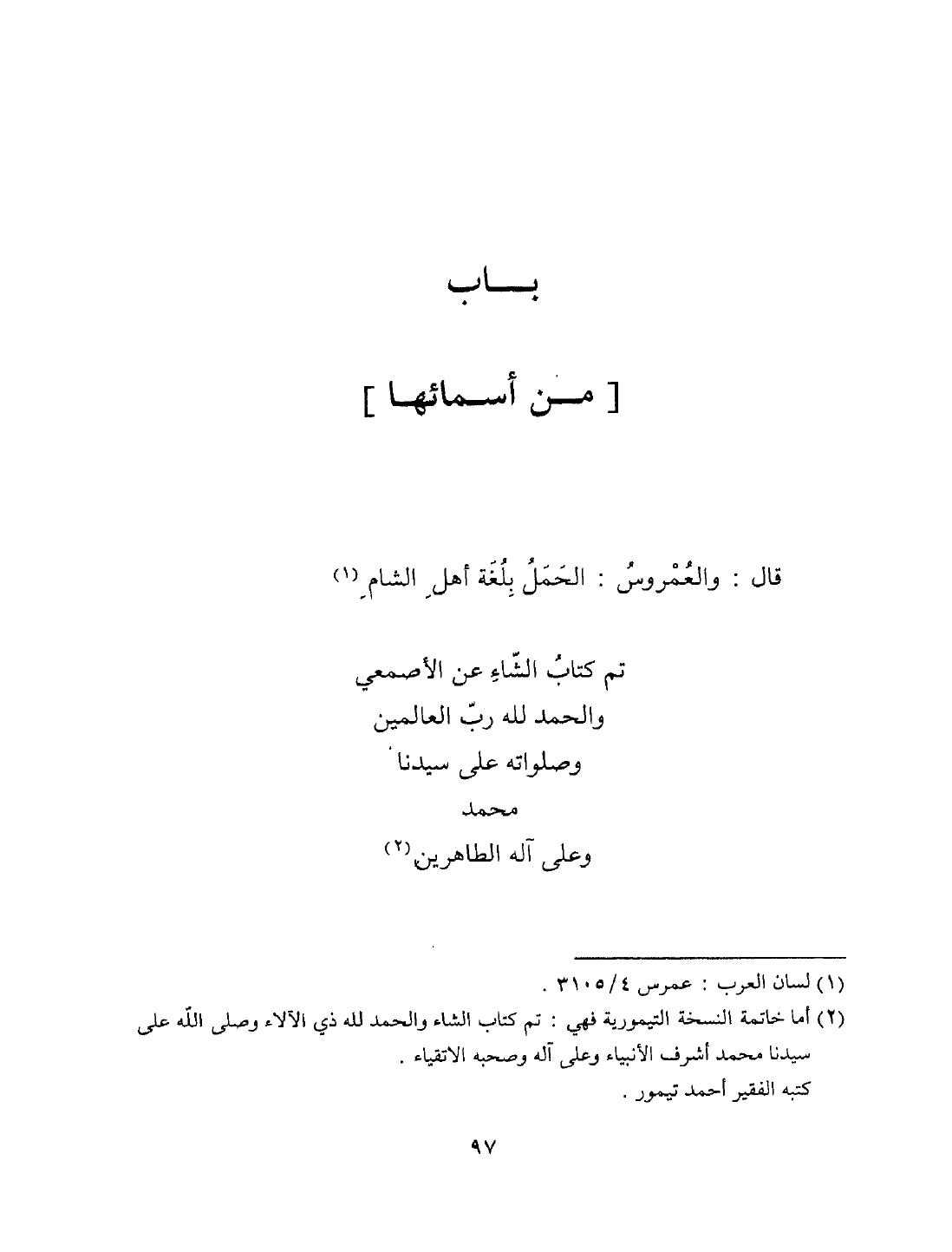 تم كتاب الشاء عن الأصمعي والحمد لله رب العالمين وصلواته على سيدنا محمد وعلى آله الطاهرين