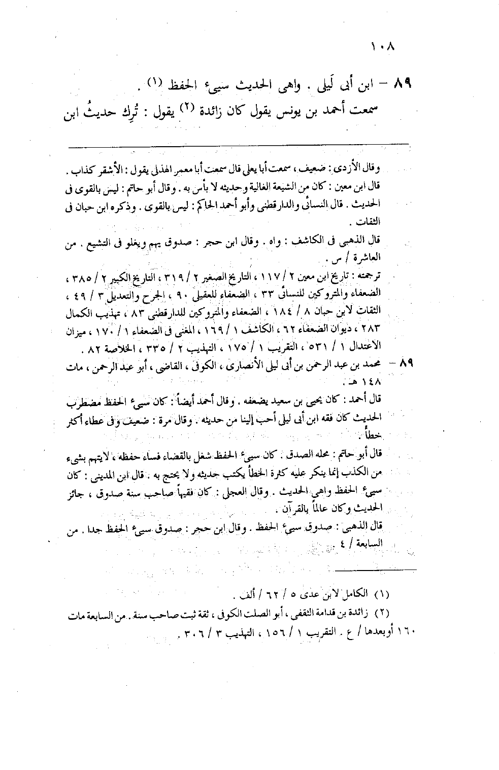 86 - ابن أبي ليلى واهي الحديث سيئ الحفظ سمعت أحمد بن يونس يقول كان زائدة يقول ترك حديث ابن