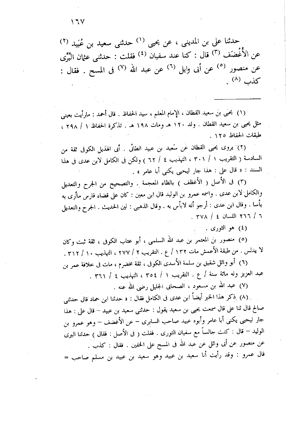 حدثنا علي بن المديني عن يحيى حدثني سعيد بن عبيد عن الأغضف قال كنا عند سفيان فقلت حدثني عثمان البري عن منصور عن أبي وائل عن عبد الله في المسح قال كذب