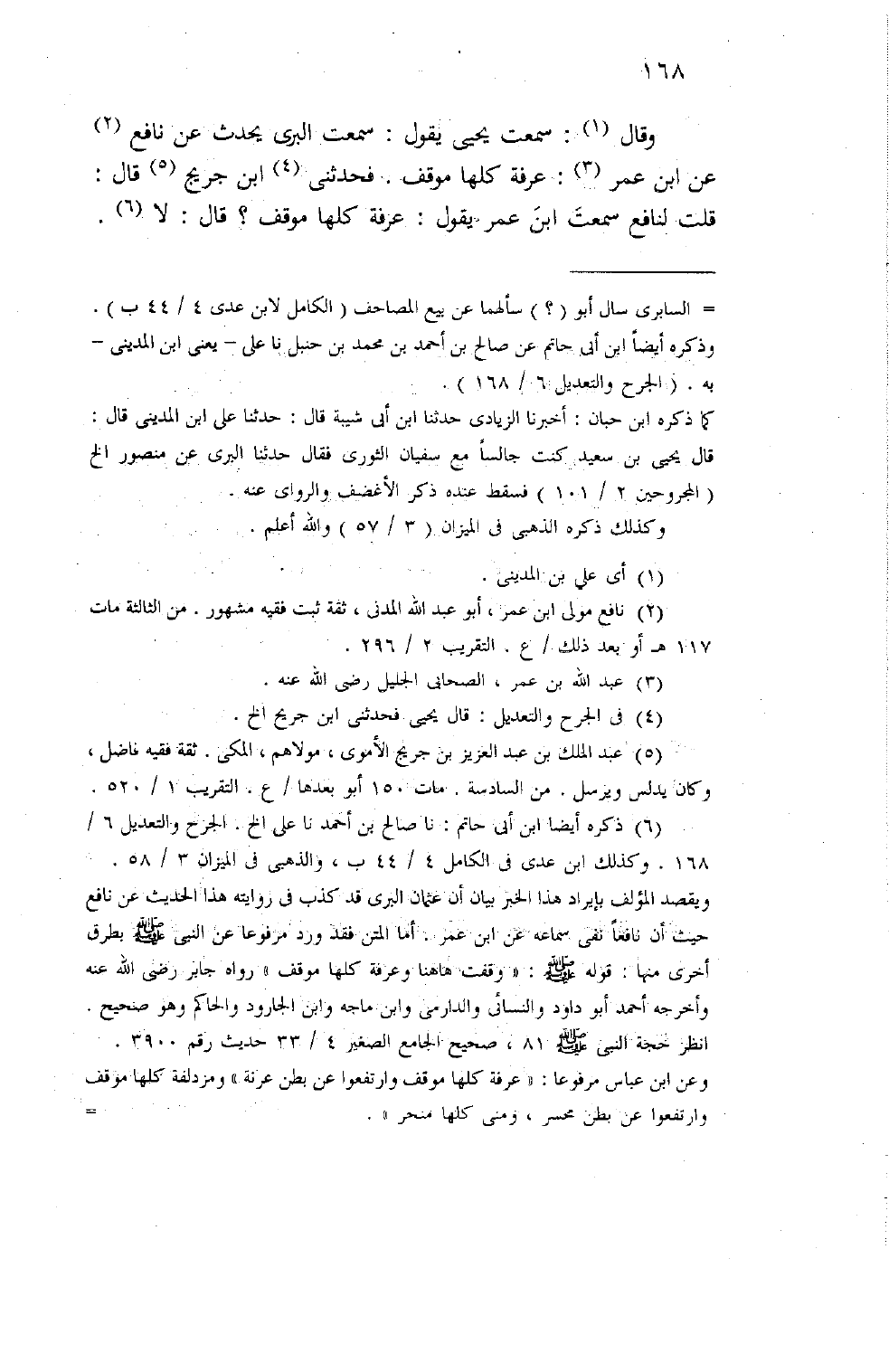 وقال سمعت يحيى يقول البري يحدث عن نافع عن ابن عمر عرفة كلها موقف فحدثني ابن جريج قال قلت لنافع سمعت ابن عمر يقول عرفة كلها موقف قال لا