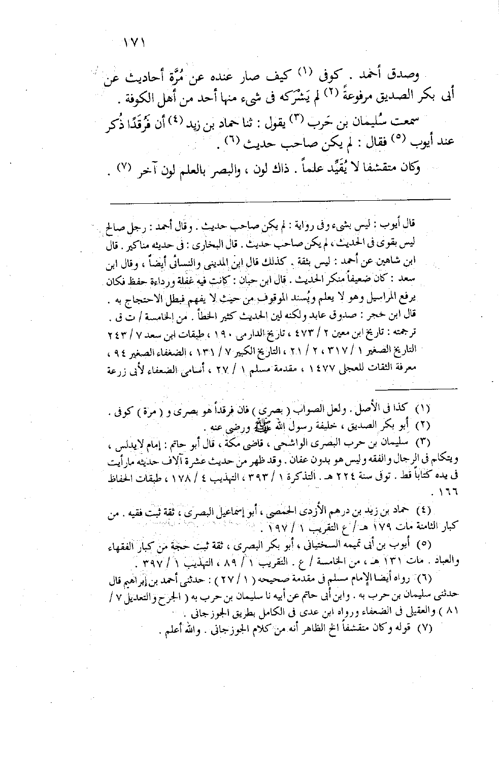 وصدق أحمد كوفي كيف صار عنده عن مرة أحاديث عن أبي بكر الصديق مرفوعة لم يشركه في شيء منها أحد من أهل الكوفة سمعت سليمان بن حرب يقول حدثنا حماد بن زيد أن فرقدا ذكر عند أيوب فقال لم يكن صاحب حديث وكان متقشفا لا يقيد علما ذاك لون والبصر بالعلم لون آخر